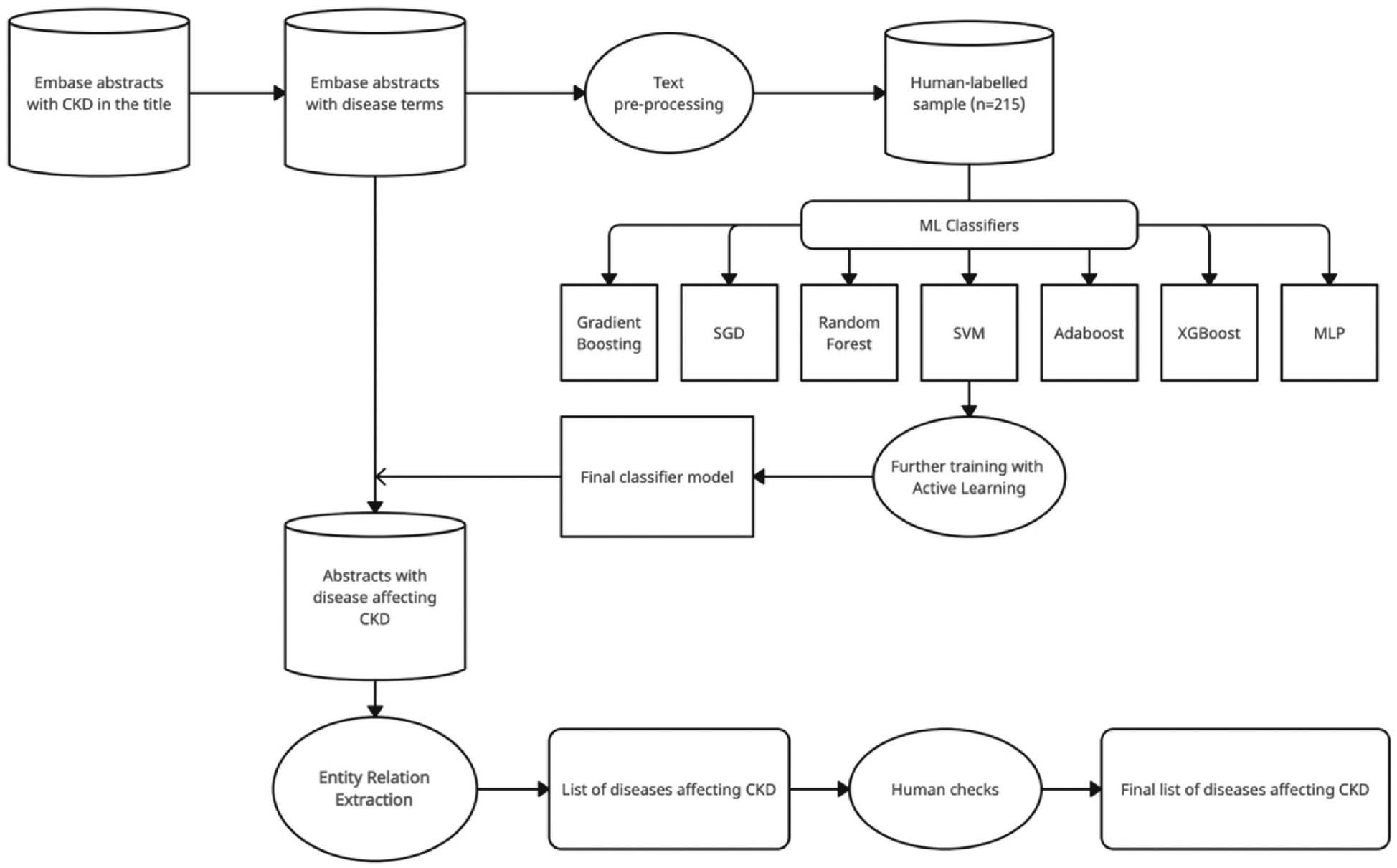 We analysed 39,680 abstracts with CKD in the title from the Embase library. Abstracts about a disease affecting CKD development and/or progression were selected by multiple ML classifiers trained on a human-labelled sample. The best classifier was further trained with active learning. Disease names in question were extracted from the selected abstracts using a novel entity relation extraction methodology. The resulting disease list and their corresponding abstracts were manually checked and a final disease list was created.
