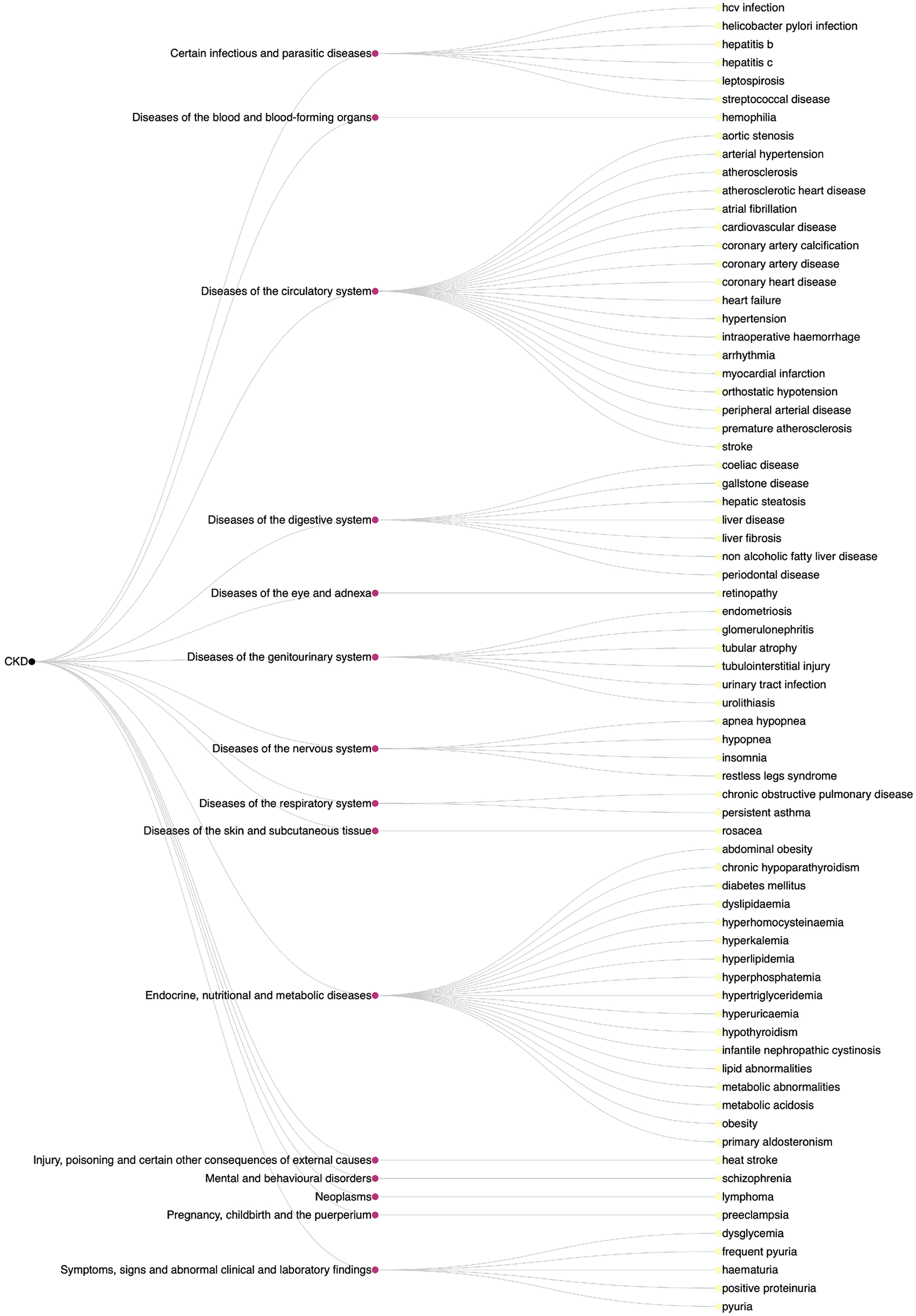 The result of our study was the creation of a comprehensive disease list, comprising of 68 disease names across 15 ICD-10 disease categories, as shown in Figure 2. This list was refined by manually checking each disease name against the original abstracts to eliminate false positives, such as CKD complications (e.g., anaemia and abdominal aortic calcification) which were initially misidentified as causes.