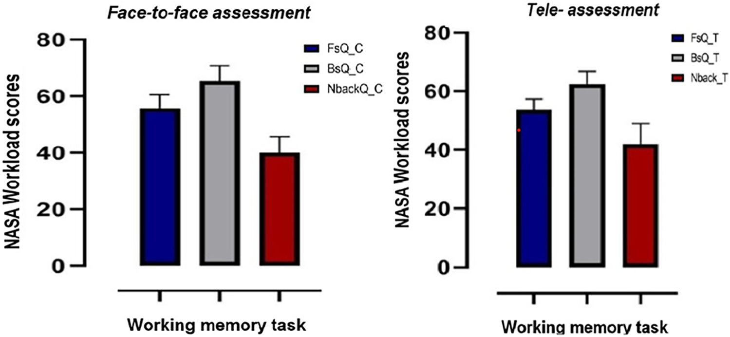 In interpreting the findings related to the mental load across WM tasks, this study draws upon the literature. Based on the participants' ratings and weighted subjective assessment using the NASA workload index, the backward digit task (BsQ) was difficult, with higher scores than the forward digit task (FsQ) and n-back task (2backQ) in the tele-assessments and in the face-to-face mode of assessment (Figure 5). These findings can be attributed to different factors including the greater attentional demands required for the backward digit span task (18) and the reversal in directionality when recalling the digits in the backward digit span task (26). Many studies have also reported a recency effect in which participants could recall the last few digits in a sequence of digits that were presented in the backward digit task more easily compared to the first few digits in the sequence (27).