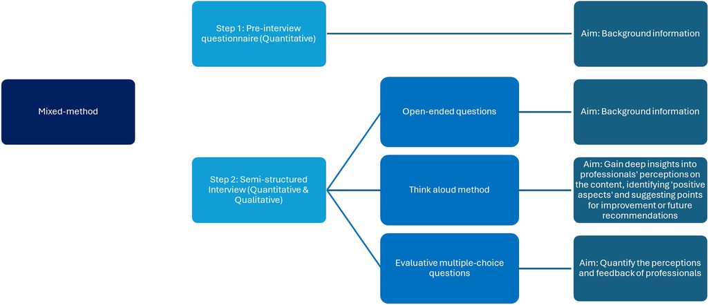 Ethical approval was obtained from the Psychology Research Ethics Committee at the University of Leiden (Breeman, dr. L.D.-V2-4262). The IeG was assessed using a mixed-methods framework, blending qualitative and quantitative techniques (see Figure 3). Data were collected in one session using semi-structured interviews and the think-aloud method (25, 26). The think-aloud approach enabled participants to verbalize their thoughts and reasoning, offering rich insights into professional perceptions of the IeG, identifying both positive aspects and points for improvement. Quantitative feedback was gathered through a survey featuring evaluative multiple-choice questions, providing a balanced view of professional responses across different phases of eHealth intervention: development, reach, adherence, evaluation, and implementation.