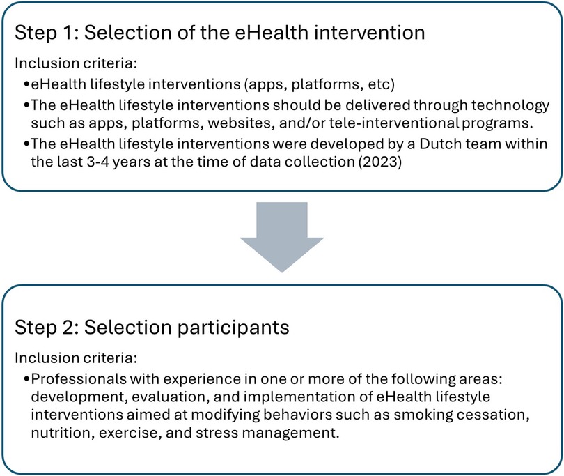The relevance of IeG content was evaluated through interviews with researchers and developers from various eHealth-interventions. Data was collected in two steps. First, 8 eHealth lifestyle interventions were selected based on specific criteria (Figure 4) to assess IeG practicality and feasibility. This offered the opportunity to identify areas for improvement to enhance IeG applicability. To find suitable eHealth interventions, we compiled a list of eHealth lifestyle interventions based on internet searches and recommendations from colleagues in the field. Subsequently, we contacted individuals responsible for these interventions, inquiring about case suitability based on the selection criteria. In the second step, upon identifying a suitable case, we inquired via email or face-to-face about individuals' intent to participate in this study. Suitable candidates were those involved in at least one phase of their eHealth intervention, excluding those previously engaged in the IeG development. We did not consider participants' experience with lower SEP groups as a selection criterion, because this study aimed to gather diverse perspectives to identify potential gaps in the IeG and improve its general applicability. Including professionals with varying levels of experience allowed us to explore a range of needs and perceptions. This included both those highly familiar with the target group and those less experienced but still involved in relevant intervention work. This variation provided insight into how the guide is understood and used by professionals across different backgrounds and levels of familiarity with inclusive design. The content of the guide was informed by earlier research involving the target group (27). In this phase, the focus was on professionals, as the IeG is intended to support them in designing inclusive eHealth interventions.