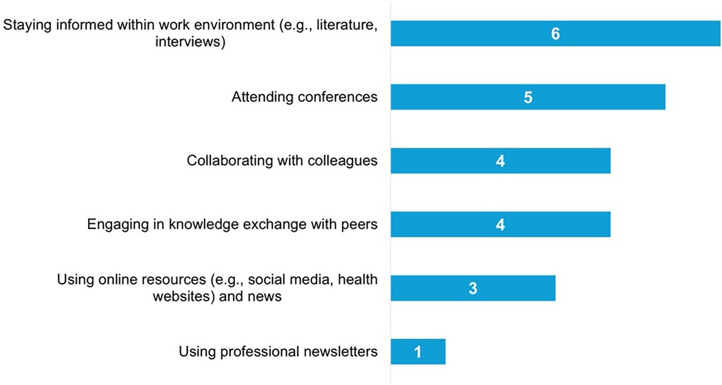 Participants reported various methods to maintain and update their knowledge in this area, as derived from the interviews (See Figure 5). Several key resources used for developing eHealth interventions for lower SEP populations included collaborating with the target group (e.g., following the eHealth for All principle), using the Pharos (Dutch Centre of Expertise on Health Disparities) Centre's guidelines, and ensuring B1 level readability, suitable for basic language proficiency.