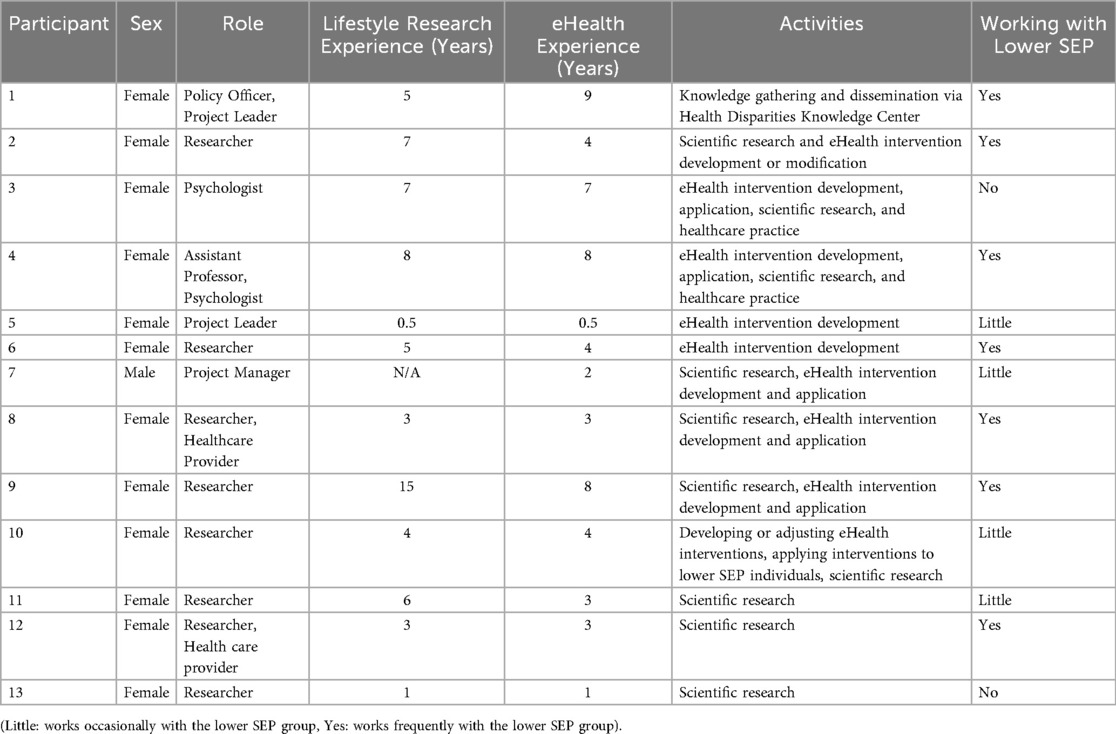 This study involved a total of 13 professionals, including eHealth developers, healthcare providers, researchers, and policy officers, who engaged in eight different eHealth lifestyle interventions, varying from lifestyle management to sleep-related interventions. Of the 54% of participants who reported having worked with people with a lower SEP background, 31% reported having only limited experience (Table 1). The average length of time that participants were involved in these interventions was 2.65 years (SD = 1.32).