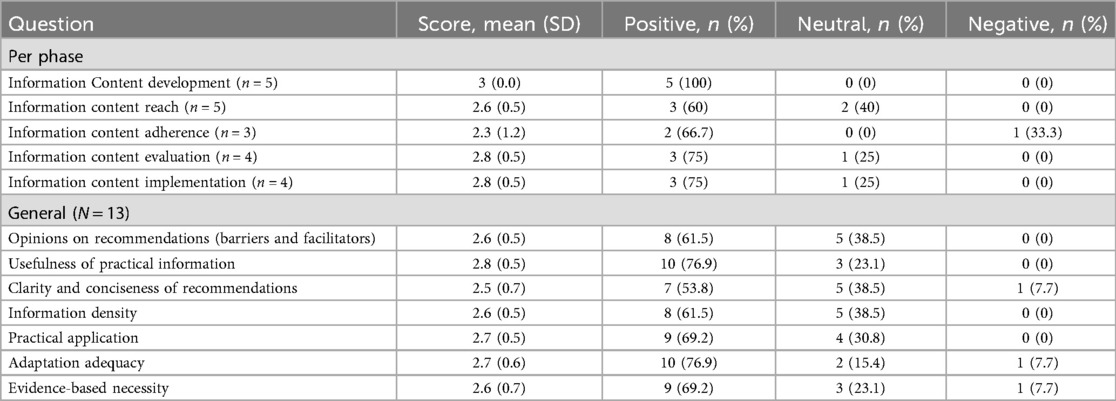Based on their experience with various phases of their own eHealth interventions, participants evaluated the IeG across different phases: “reach” and “implementation” were assessed by 38% of participants (n = 5 each), followed by “development” and “evaluation” (31%, n = 4 each). The “adherence” phase received less focus (23%, n = 3). Table 2 summarizes participants' ratings of the guide across the eHealth intervention phases.