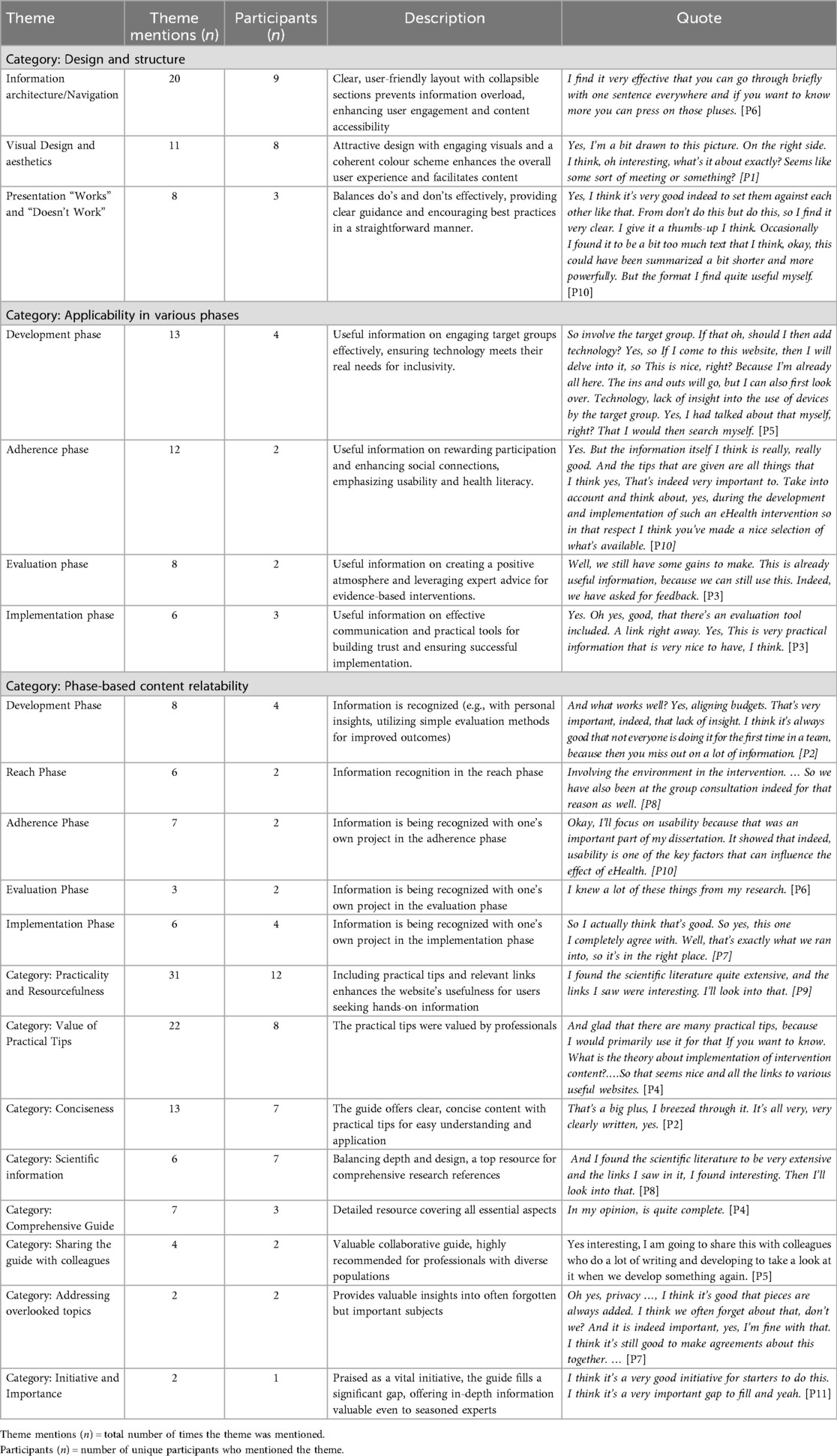 Most participants (84.6%, 11/13) considered the guide valuable for a broad range of professional roles, including developers, researchers, healthcare providers, and project managers. It was perceived as relevant throughout the entire eHealth development process. Participants reported different preferred moments of use depending on their role: developers and project leaders mostly used the guide in the planning or grant-writing phase, while healthcare providers and researchers revisited it during implementation and evaluation. Several participants preferred using it at an early stage, such as during proposal writing or intervention planning, noting it was useful “before you write the grant” (P12). Others highlighted its continued relevance during later phases, such as implementation and evaluation, indicating they would “look at it again” when applying or reviewing content (P2). These findings reflect the guide's flexibility and usability across different professions and project phases. Supplementary Table S2 provides an overview of suggested users and timing of use.