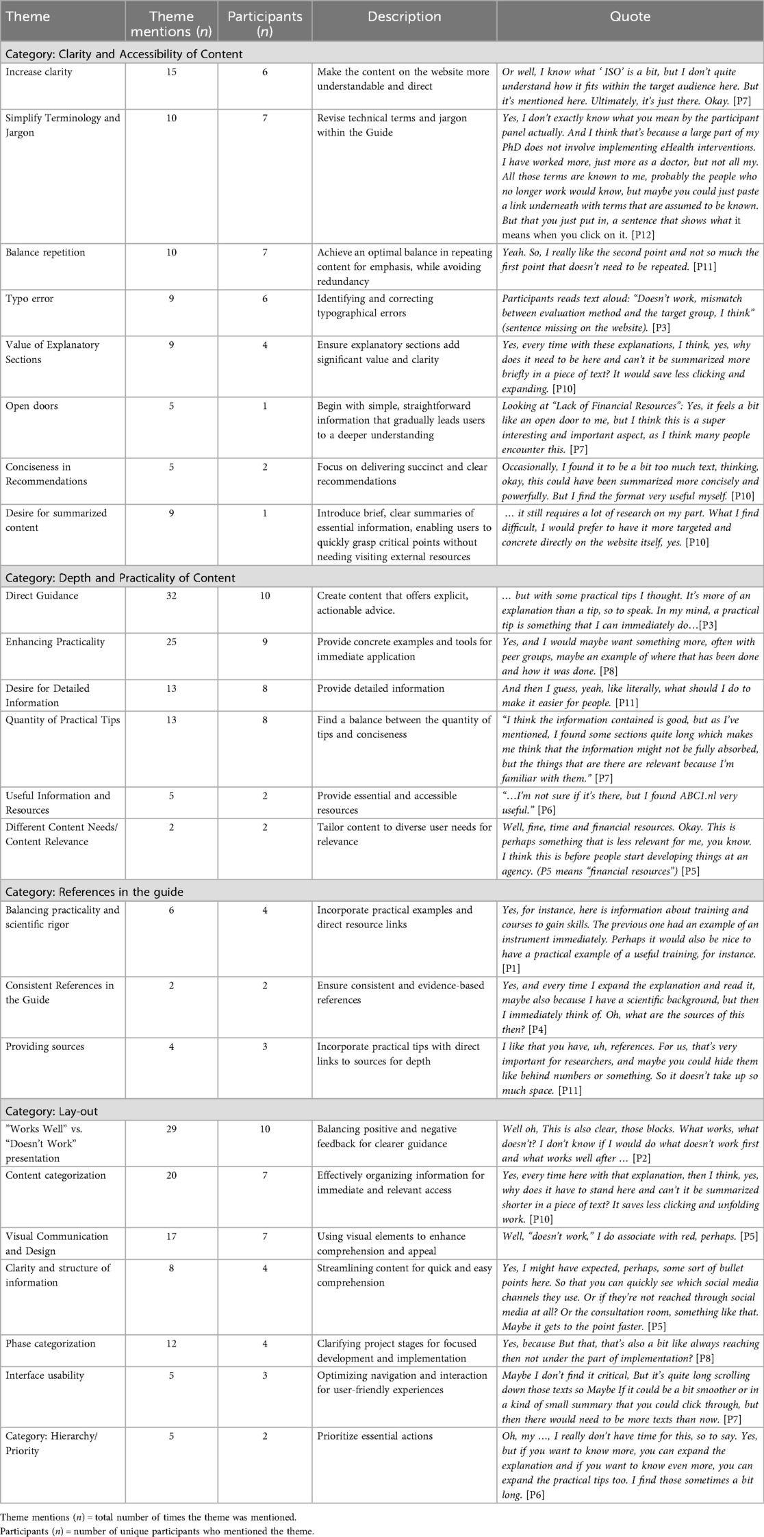 Reflecting on the IeG applicability and practicality, almost all participants (12/13) across various phases concurred on several positive aspects. The majority (8/12) valued the website's practical tips, including the concrete guidance, tools, and strategies provided. They appreciated the easy access to information via evaluation instruments, participatory research, and hyperlinks, finding it helpful for implementing interventions and overcoming challenges. As expressed by one participant (P9, Researcher), the guide is “filled with concrete tips that are feasible and understandable”.