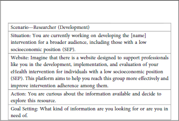 Interviews were conducted by the first author online or in-person, lasting 50–60 min, and recorded using Microsoft Teams or a voice recorder. The interview process was divided into three segments (see Figure 3). Before the interview, participants received an email with an information letter, a background questionnaire link, and access to the IeG. This pre-interview questionnaire collected data on their roles and experiences in eHealth interventions, particularly concerning lower SEP populations. If participants had not completed the questionnaire prior to the interview, it was completed during the session. The interview began by exploring the resources, documents, and guidelines participants used in their eHealth interventions, their experience with designs for people with a lower SEP, and familiarity with inclusive design principles. This was followed by a discussion on their eHealth intervention involvement, including objectives, target demographics, and SEP considerations (29, 30). Subsequently, the “think-aloud” method was employed. Participants were asked to navigate the IeG online, selecting intervention phases relevant to their experiences. A scenario provided a starting point for exploration, which they could adapt to their needs (see Box 1). They were tasked with examining the homepage, sharing thoughts, noting details, and discussing encountered recommendations and practical advice. In the final part, participants answered multiple-choice questions about the guide's clarity, conciseness, and whether the eHealth intervention phases contained adequate information for developing interventions aimed at people with a lower SEP.