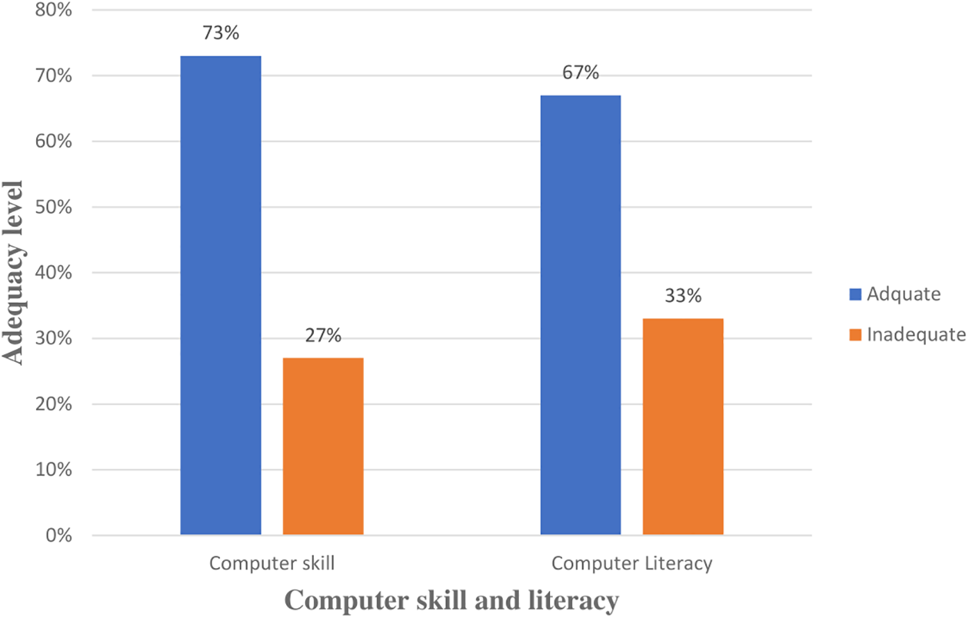 In this study, 280 (73%) health professionals had sufficient computer skills. Likewise 259 (67%) health professionals had high computer literacy (Figure 2).