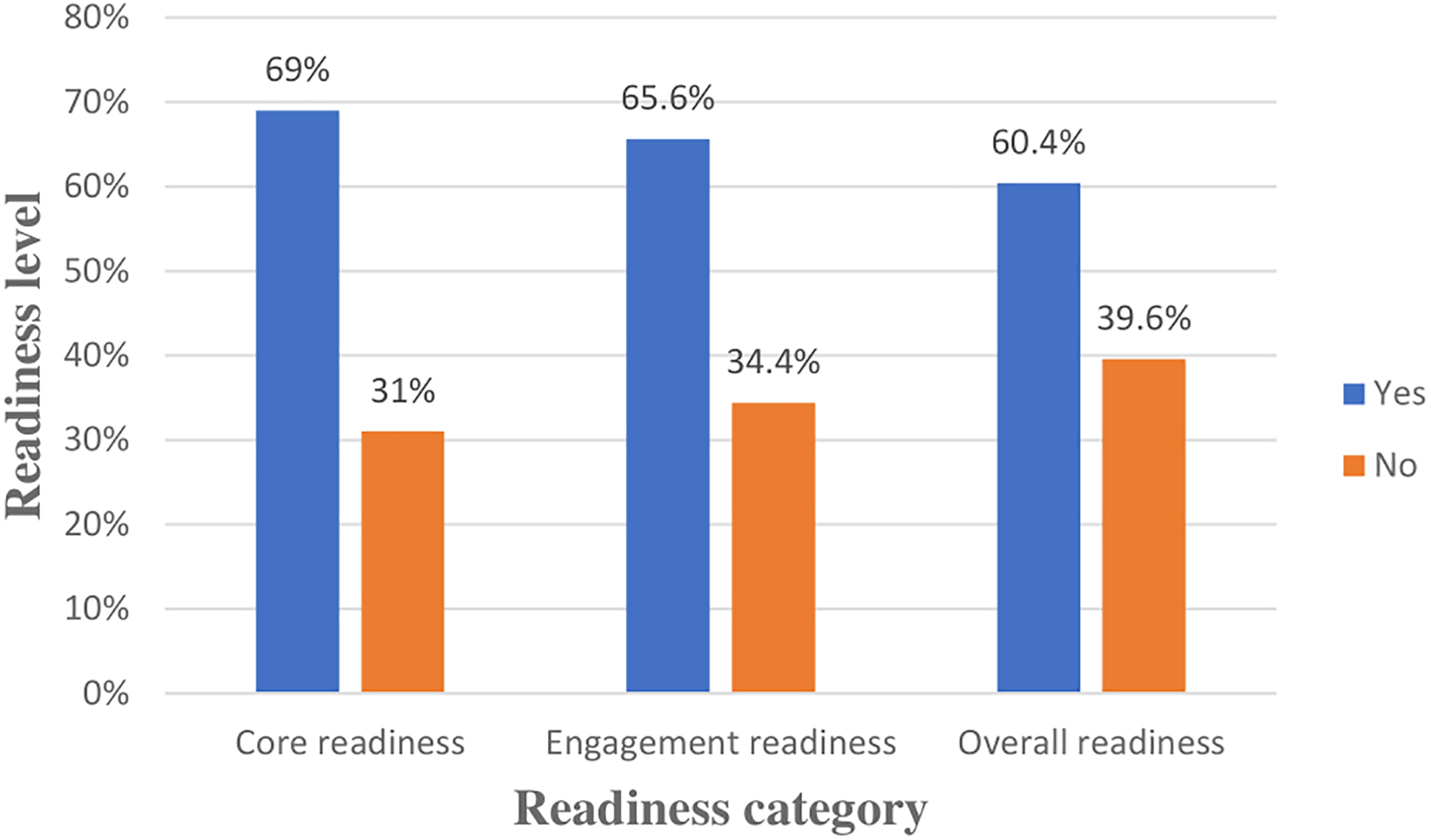 Overall readiness is the intersection of core readiness and engagement readiness. Health professionals who possess both core readiness and engagement readiness are considered to have overall readiness (2, 24).