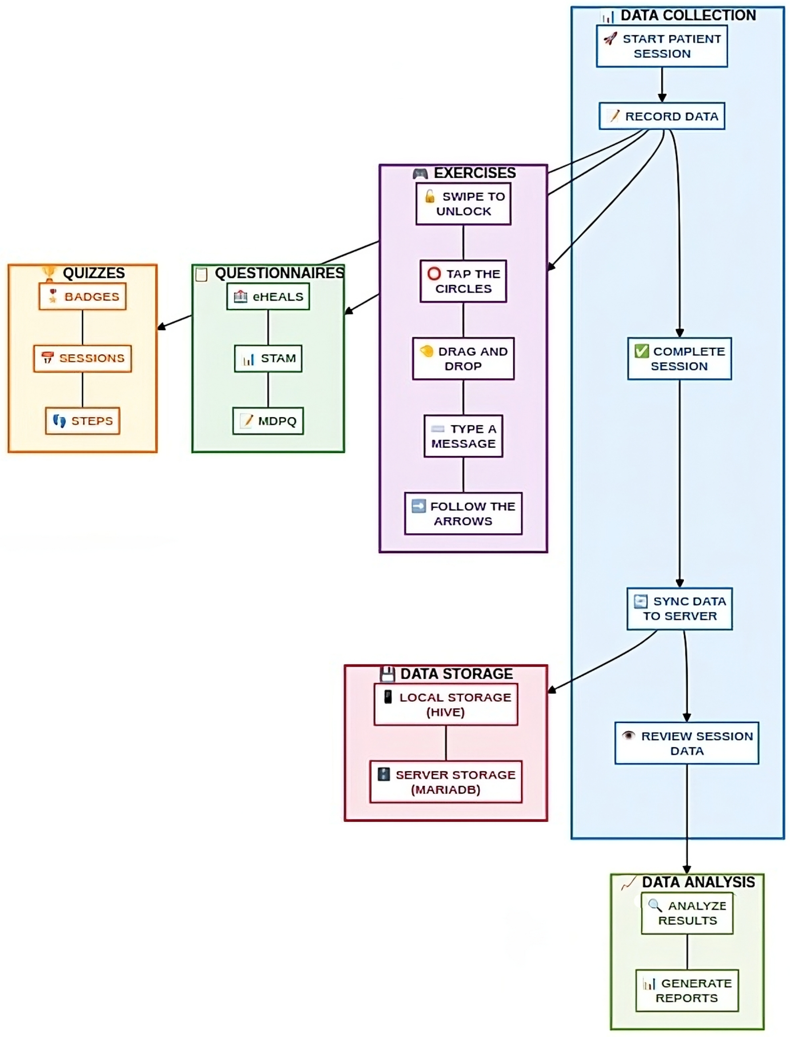 The eHealth Literacy App was developed using a comprehensive methodological approach that addresses both technical and user-centered requirements. Before detailing the individual components, it is important to understand the overall structure and workflow of the app. The app operates in dual-mode, incorporating the patient mode for clinical use with specific patient data and session tracking, and the demo mode for training or demonstration purposes without patient data requirements. Figure 1 illustrates the overall workflow of the app and shows how the user progresses through the stages of data collection, exercise-questionnaires-quizzes completion and data synchronization. This workflow forms the foundation for all technical implementation decisions described in the following subsections.