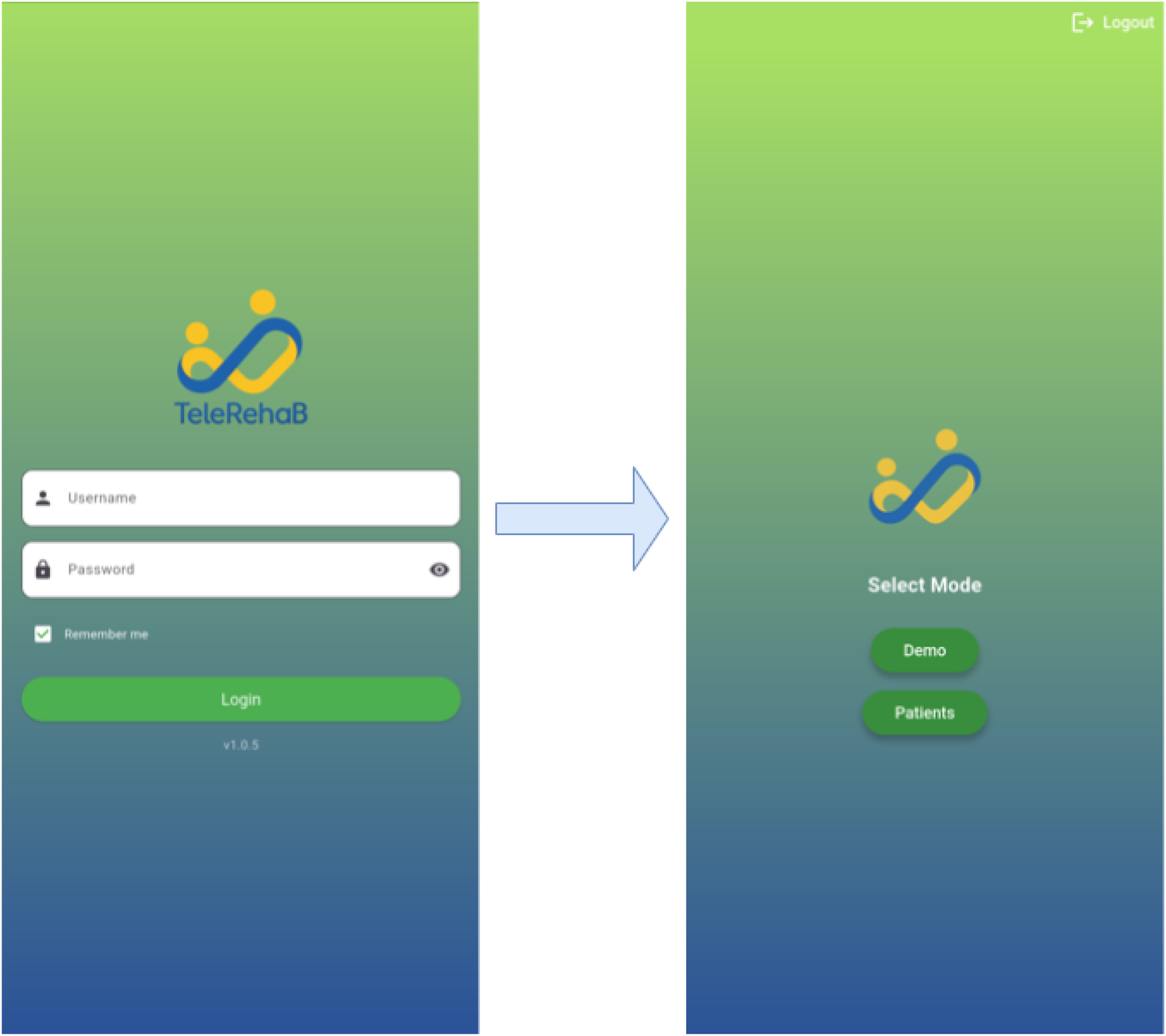 The app has several screens designed to guide the user through exercises and questionnaires to assess their eHealth literacy. One of the most important screens is the login screen, where clinicians can enter their credentials. Patient mode and demo mode are the two different operating modes that are displayed after logging in, as shown in Figure 2. Each patient in patient mode is linked to a unique patient ID and session, so it is intended for use in a clinical environment (21). On the other hand, in demo mode, no patient-specific credentials are required to test and explore the app. This two-mode system is intended for research or demonstration purposes in addition to practical clinical use. In the Patient Mode, clinicians can see a list of their patients. Each patient can have multiple sessions, with an overview of completed and pending exercises. The interface allows clinicians to select patients and review their progress across different therapy sessions.