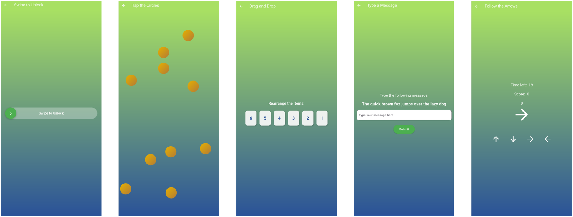 The performance-based exercises are designed to assess different aspects of digital literacy and motor skills (22). The “Swipe to Unlock” exercise measures the user’s ability to interact with touchscreen surfaces and records the time it takes to perform the action. The “Tap the Circles” exercise assesses fine motor skills and reaction time, recording both successful and failed touches. The “Drag and Drop” exercise assesses the user’s ability to manipulate objects onthe screen and measures the time it takes to arrange the objects correctly. The “Type a Message” exercise assesses typing skill by measuring time to completion, typing errors, time to first backspace and total number of backspaces. Finally, the “Follow the Arrows” exercise tests the user’s ability to follow the on-screen instructions and records the score and the total number of arrows displayed.