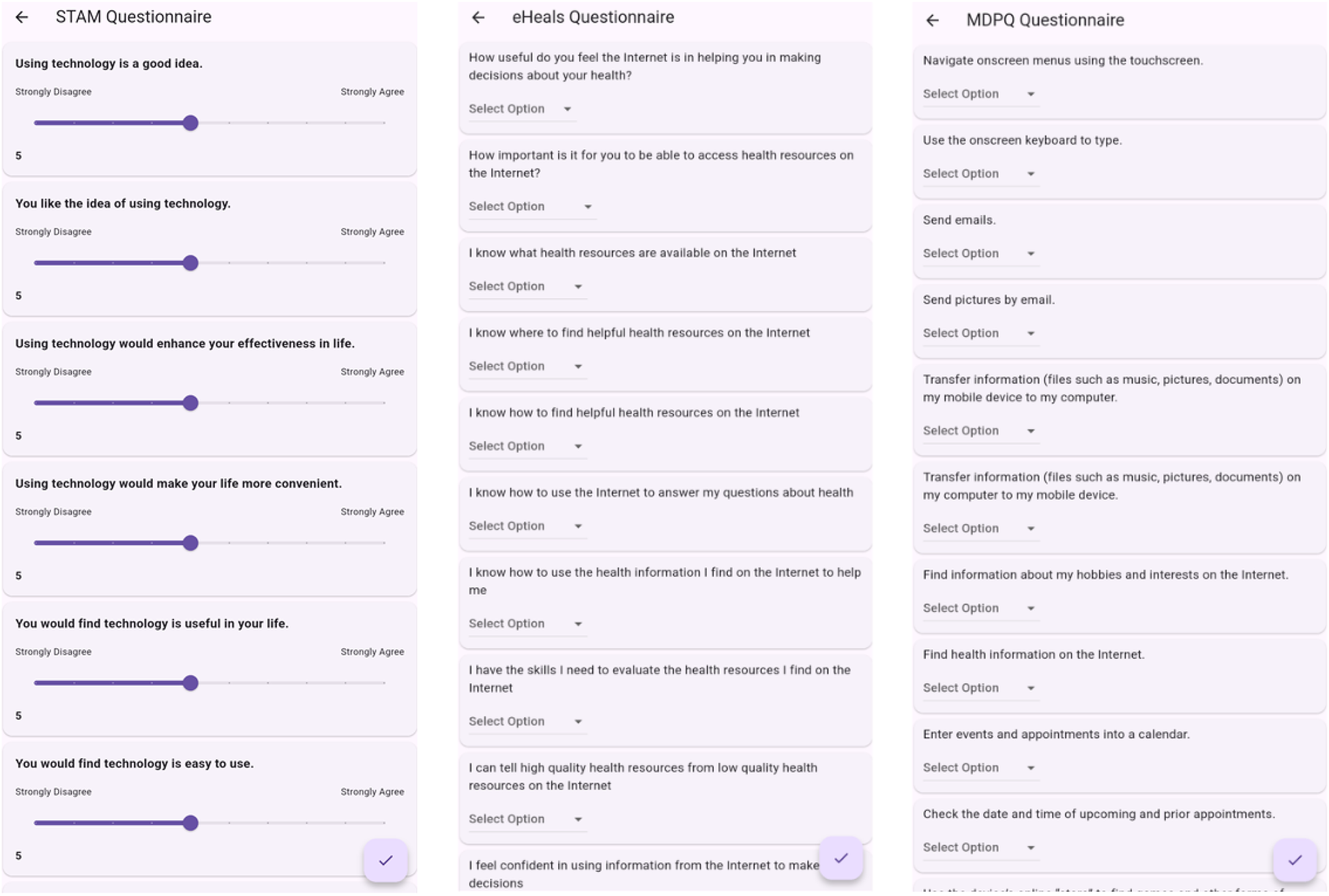 Before each questionnaire is started, the patient is shown an instructions’ screen (28). This screen is designed to provide clear and concise information about the purpose of the questionnaire and instructions on how to complete the questionnaire. For example, before the eHealth Literacy Scale (eHEALS), the introductory screen explains the importance of assessing the user’s confidence in accessing and understanding online health information. Similarly, before the Senior Technology Acceptance Model (STAM) and the Mobile Device Proficiency Questionnaire (MDPQ), the user gets informed of the specific objectives of the questionnaires, that might involve evaluating the benefits of using mobile devices or measuring the usability of the equipment (29).