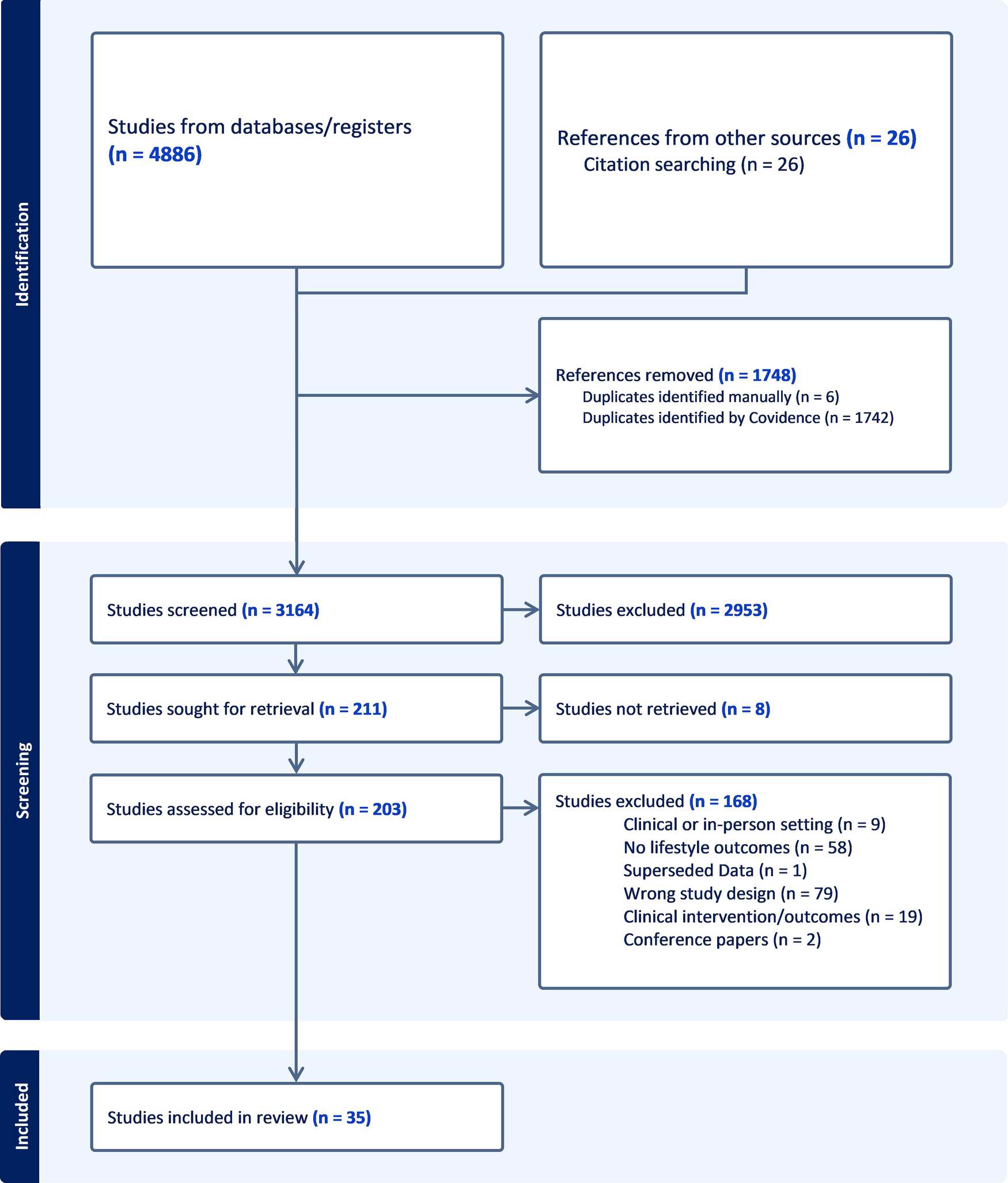 | Outcomes | Studies were included if they reported at least one of the pillars of lifestyle as its primary outcome. Studies were excluded if their primary outcomes were clinical or biomedical |