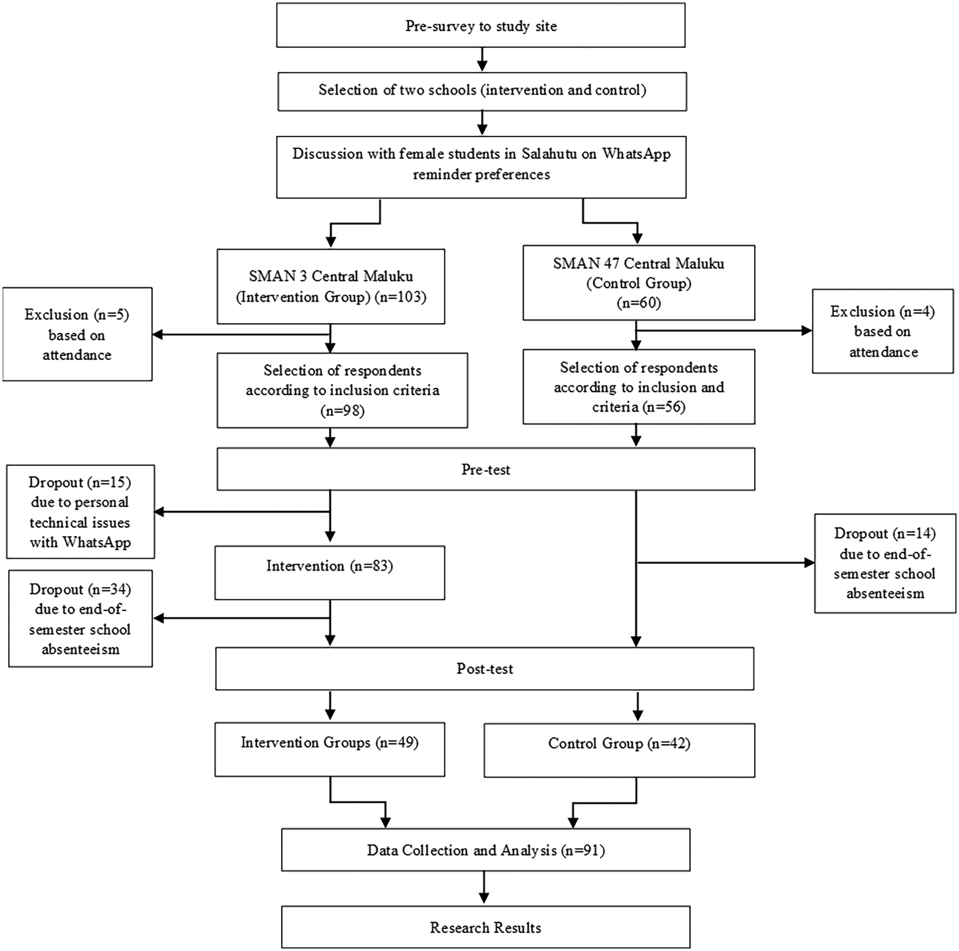The inclusion criteria for the study subjects in each high school were: (1) female students from Grades X and XI, and (2) willing to participate in the study. For the intervention school, additional criteria included were: (1) owning a communication device (smartphone, tablet, or laptop) with regular internet access, and (2) having or being willing to install the WhatsApp (WA) application. In total, there were 49 adolescent girls from SMAN 3 Maluku Tengah (intervention school) and 42 from SMAN 47 Maluku Tengah (control school) were included in this study (Figure 1).