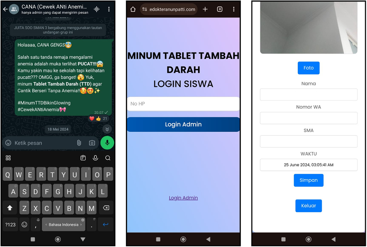In early 2024, a survey among senior high school students in the Salahutu Sub-District of Central Maluku District, Maluku Province, was conducted to assess smartphone penetration, internet access, and social media preferences (data not published). The survey revealed that 94% of the 186 respondents owned smartphones, had adequate internet access, and primarily used WA applications. Thereby, based on these findings, in early 2024, researchers from the Faculty of Medicine, Pattimura University, developed some WA-based reminder messages for adolescent girls related to anemia and its prevention as well as reminders to take WIFAS provided at schools. This present study aimed to evaluate the impact of these WA-based reminder messages on knowledge and awareness about anemia and adherence to WIFAS among adolescent girls in Salahutu Sub-District, Maluku Province, Indonesia.