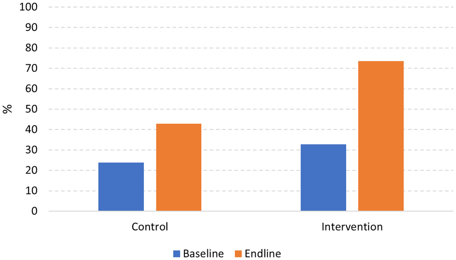 In this study, we compared the knowledge difference between respondents in the intervention and control schools before and after the intervention, as shown in Table 2. The baseline survey showed that there was no significant difference in the scores of knowledge on anemia and WIFAS between adolescent girls in the intervention and control school (p = 0.331). The median knowledge score was 10 for both schools. However, at the endline, a significant difference was found between these two schools, with moderate negative correlation as increased scores were more associated with the intervention group than the control group (r = 0.38 p < 0.001). The median score in the intervention school increased to 11, while the median score in the control school remained unchanged (Table 2).