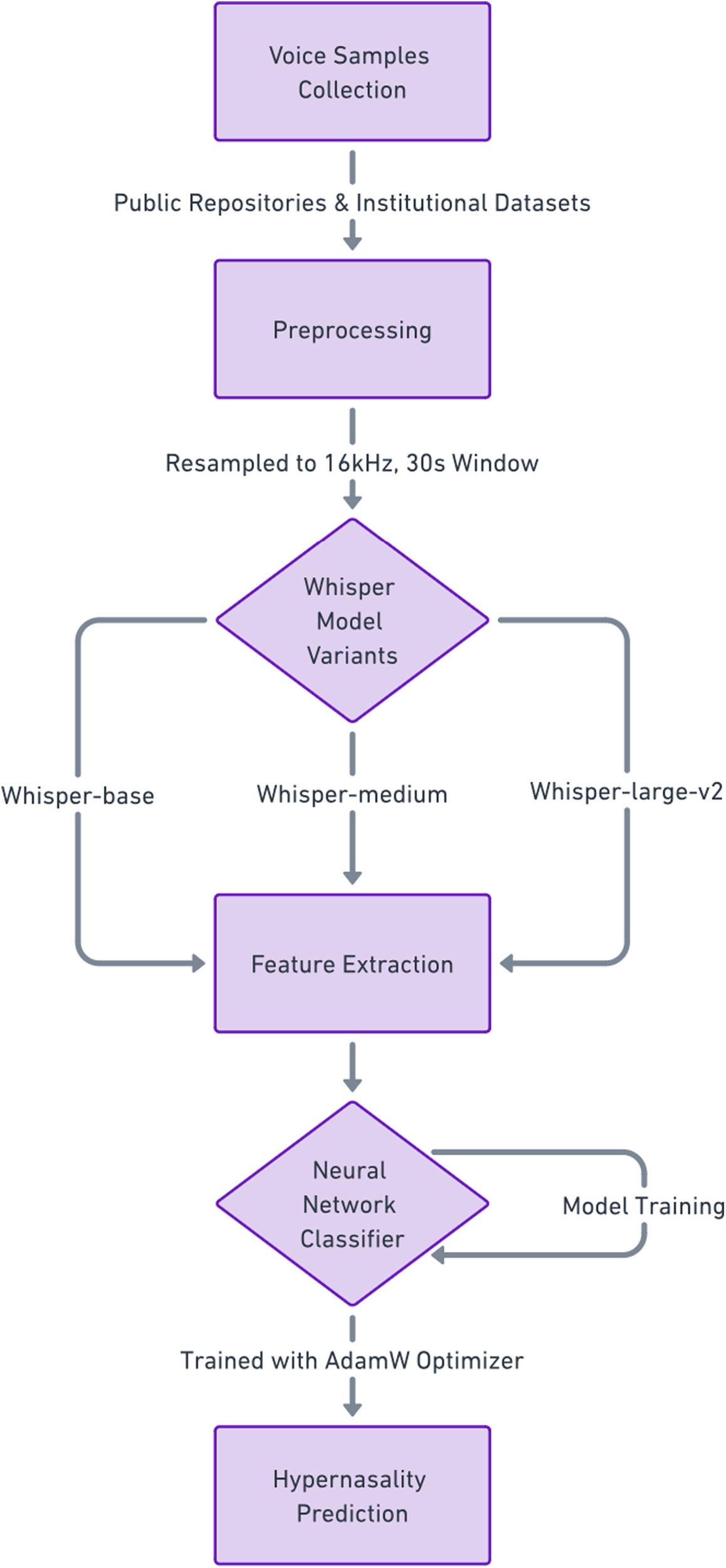 All recordings were preprocessed into WAV format and resampled to 16 kHz to ensure compatibility with the Whisper model. To standardize inputs, each recording was processed to fit Whisper's fixed 30 s input window by zero-padding shorter samples and truncating longer ones. Metadata, including recording conditions and file duration, was cataloged for each sample.