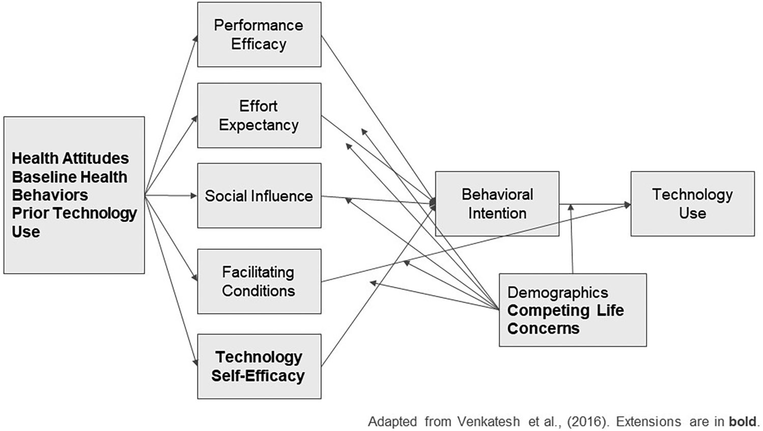 The Unified Theory of Acceptance and Use of Technology (UTAUT) presents a synthesis of models to explain user acceptance and use of technology (24). In the UTAUT, factors including performance expectancy, effort expectancy, social influence, and facilitating conditions, along with moderators (i.e., age, sex), influence the behavioral intention to use technology, which in turn leads to actual technology use. For example, older adults assess the potential for usefulness and enjoyment that the technology could bring in their everyday life (performance expectancy) when determining if they will begin or continue use (25). Social motivation, encouragement, and support from family and friends are also an important facilitators for use (21).