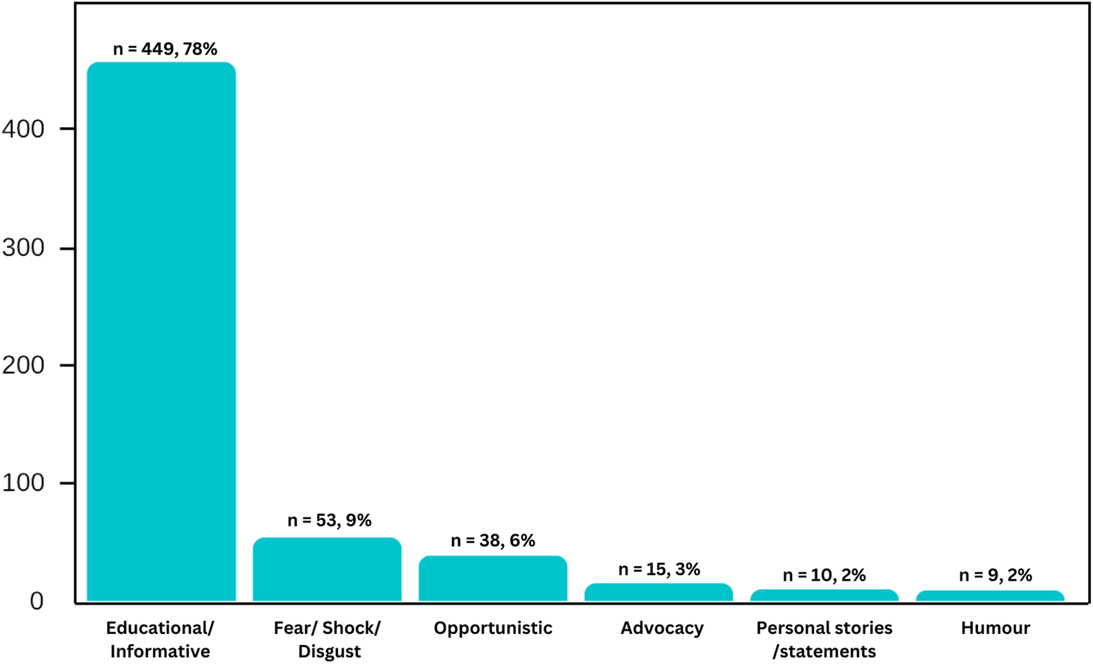 The final dataset included 574 posts over a period of 6.5 years. Figure 1 shows the classification of these posts according to message categories. The most common message category is Educational/ informative (78%), followed by Fear/Shock/Disgust (9%), Opportunistic (6%), Advocacy (3%), Personal stories/statements (2%) and Humour (2%).