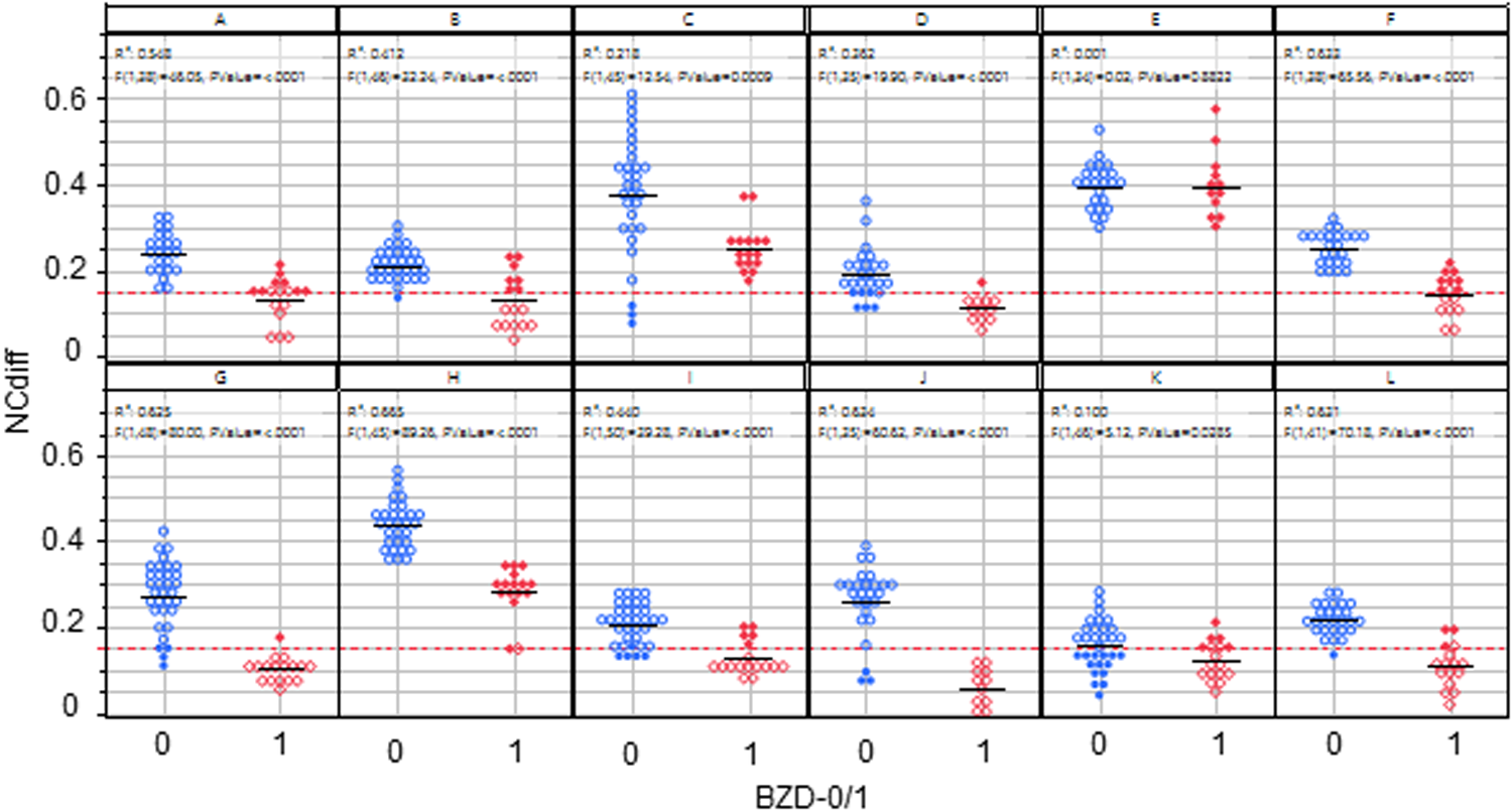 NCdiff results from all 12 subjects pre (BZD = 0) and post (BZD = 1) lorazepam administration. The red line indicates the classification limit. Open blue circles denote true negative results, filled blue circles denote false positive results, open red diamonds denote true positive results, and filled red diamonds represent false negative results.
