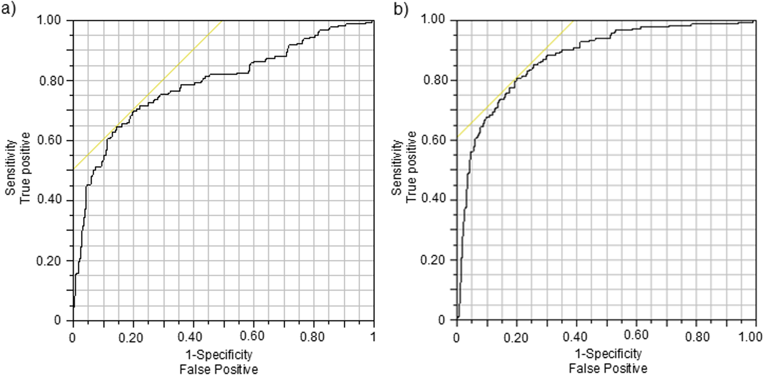 Receiver operator characteristic (ROC) graphs for classifiers indicating BZD intake based on (a) NCdiff and (b) NCdiffInd. The intersection of the yellow line and the black ROC curve defines the threshold for the classifier.