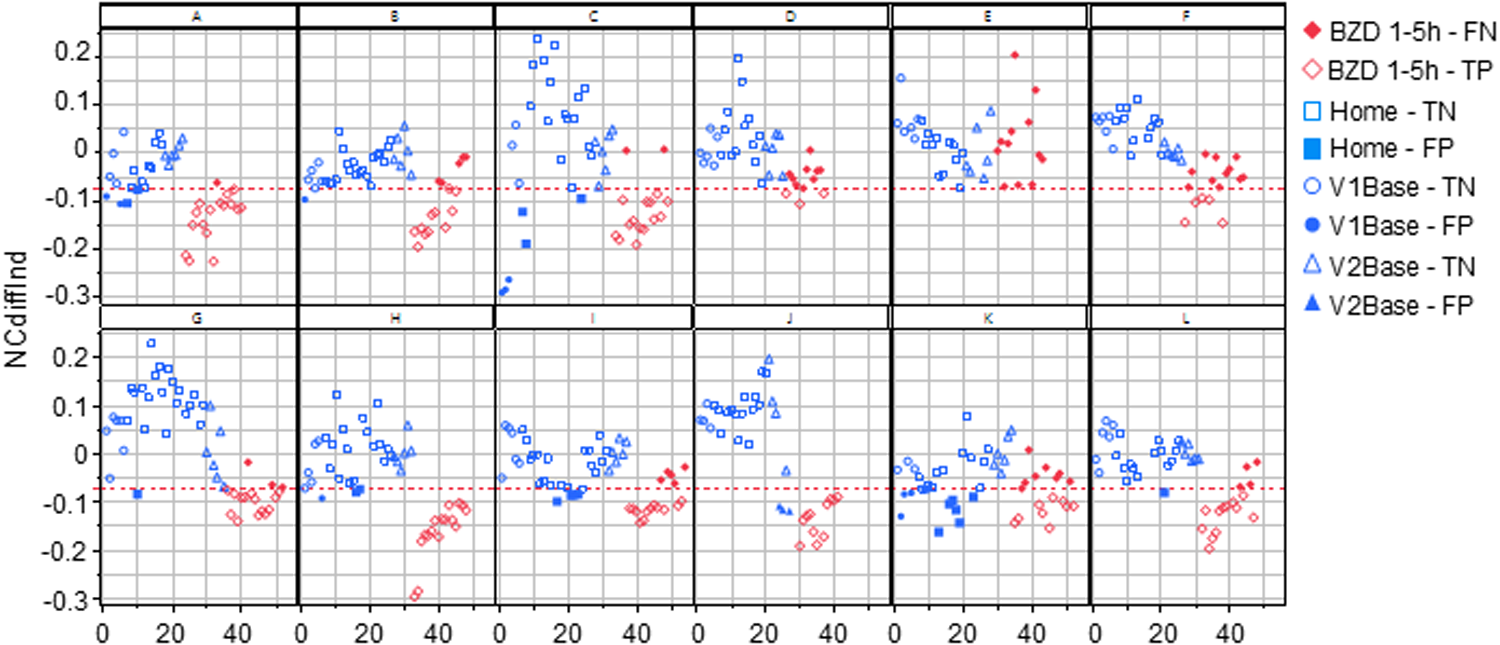 All the NCdiffInd results from all study subjects in the study are plotted in order of the performed tests. The red line indicates the classification limit. The open symbols represent true positives and negatives, while the filled symbols indicate false positives and negatives. V1Base and V2Base refer to the tests performed during the two hospital visits before drug administration. The Home-true negative (TN) / false positive (FP) tests represent all tests conducted at home between these visits. The BZD1-5h-false negative (FN) / true positive (TP) tests refer to those performed 1–5 h after the administration of 2 mg of lorazepam at visit 2.