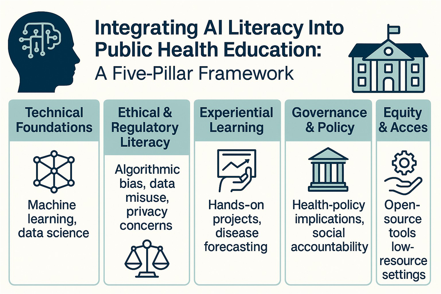 Conceptual model showing five pillars—technical basics, ethics/regulation, hands-on learning, policy governance, and equitable access—that embed AI literacy in public-health education.