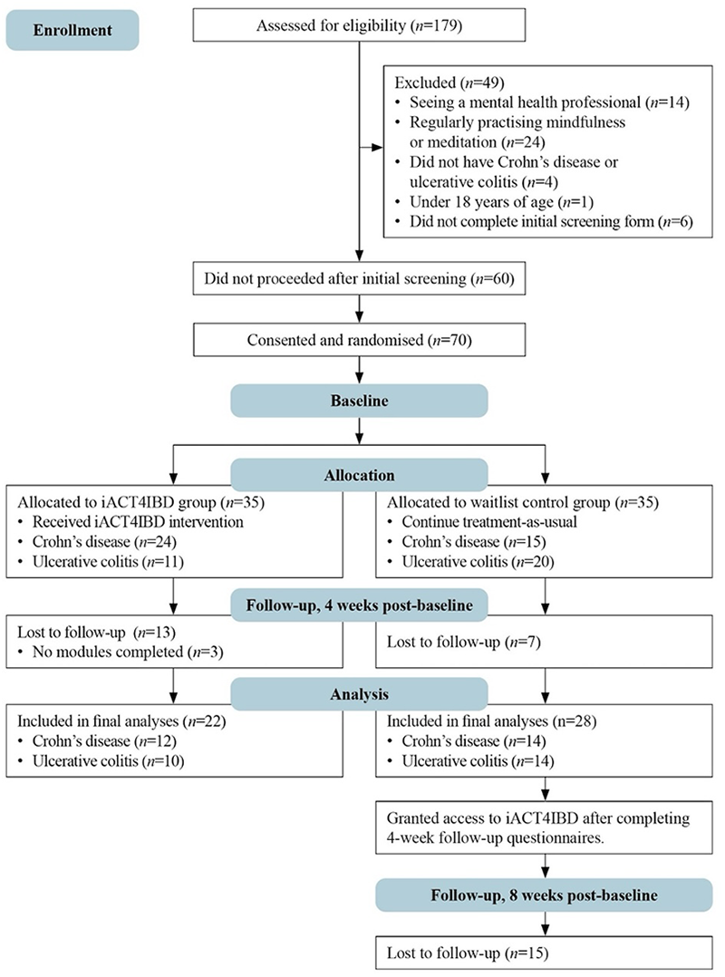 A recruitment email was sent to patients enrolled in the gastroenterology services at Auckland City Hospital and/or Greenlane Clinical Centre (Te Whatu Ora-ADHB). The study was also advertised through community organisations and online communities. All data were collected and stored using REDCap—a secure web application for managing online surveys and databases (38, 39). A researcher not involved in the study completed the randomisation using a web-based protocol (https://www.randomizer.org) to generate a random number table for group allocations. The randomisation table was pre-loaded into REDCap prior to recruitment to assign participants into either the intervention or waitlist control group after they consented to be in the study. Once screening and consenting were completed, participants were given baseline questionnaires to complete, which included demographic and clinical information, and emailed their treatment condition allocation. Four weeks post-baseline, both groups received a link to complete follow-up questionnaires. After completing these questionnaires, the waitlist group received access to iACT4IBD and then were sent a final set of questionnaires to complete 8 weeks post-baseline. Participants who completed the study were entered into a draw to win an iPad mini.