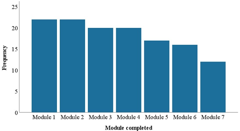 Participants self-reported their completion of and feedback for each module, with a free-form textbox collecting data on the acceptability of iACT4IBD. An acceptable adherence rate was defined a priori as the completion of at least five modules.
