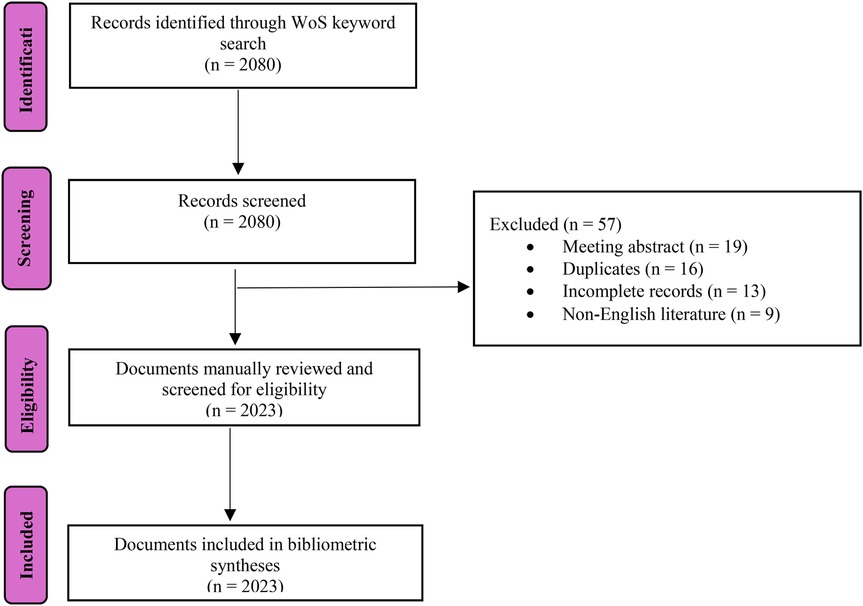 Flowchart depicting the selection process for bibliometric synthesis. Identification shows 2080 records found via WoS keyword search. Screening involves 2080 records, with 57 exclusions: 19 meeting abstracts, 16 duplicates, 13 incomplete records, and 9 non-English studies. Eligibility involves 2023 documents manually reviewed. All 2023 documents are included in bibliometric syntheses.