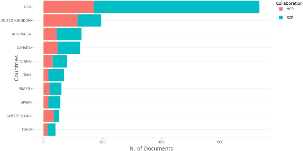 Bar chart displaying the number of documents by country related to MCP and SCP collaboration. The USA leads with over 600 documents, followed by the United Kingdom and Australia. MCP is represented in coral and SCP in teal.