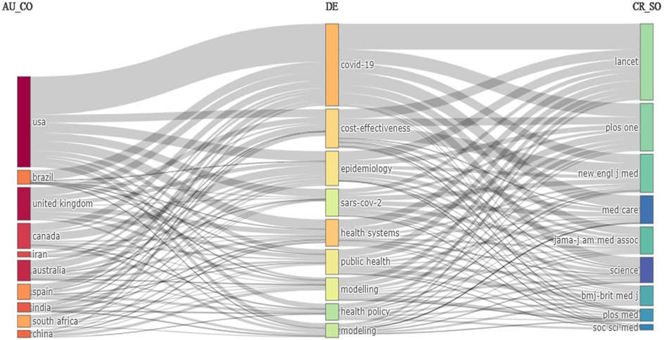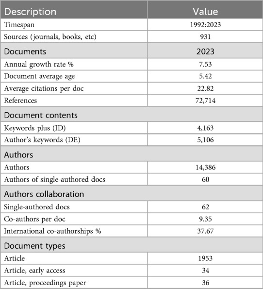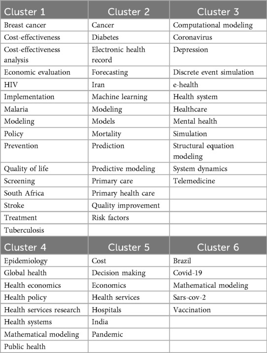 Although health systems modeling is increasingly utilized for epidemic forecasting, operational optimization, cost-effectiveness assessments, and digital health transformation, existing literature lacks a unified, wide-scope bibliometric mapping of the field. Many reviews have either focused narrowly on specific modeling methods or isolated domains such as discrete-event simulation in healthcare operations (33), simulation-based medical education (34), artificial intelligence applications (35), or virtual reality in healthcare (36) without capturing the broader intellectual structure, geographic evolution, or interdisciplinary dynamics of health system modeling. Moreover, while bibliometric tools such as CiteSpace, VOSviewer, and Biblioshiny have been successfully used to visualize scientific progress and collaboration networks (37), few studies have integrated both science mapping and performance analysis to uncover the key thematic clusters systematically, most cited authors, and institutional ecosystems shaping the field. To address these gaps, this study applies a comprehensive bibliometric analysis to 2,023 publications on health systems modeling indexed in the Web of Science from 1992–2023. According to (38), bibliometric analysis is a quantitative method used to study trends in scholarly documents such as research articles, conference papers, books, and other publications. By combining performance analysis (e.g., citation counts, author productivity, institutional rankings) with science mapping techniques (e.g., keyword co-occurrence and thematic evolution), the study aims to provide a structured and inclusive overview of the field's historical trajectory, knowledge hubs, key themes and concepts arising in the health systems modeling discourse, and promising future directions.