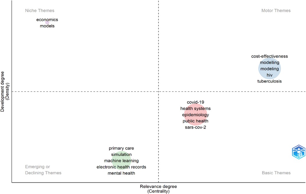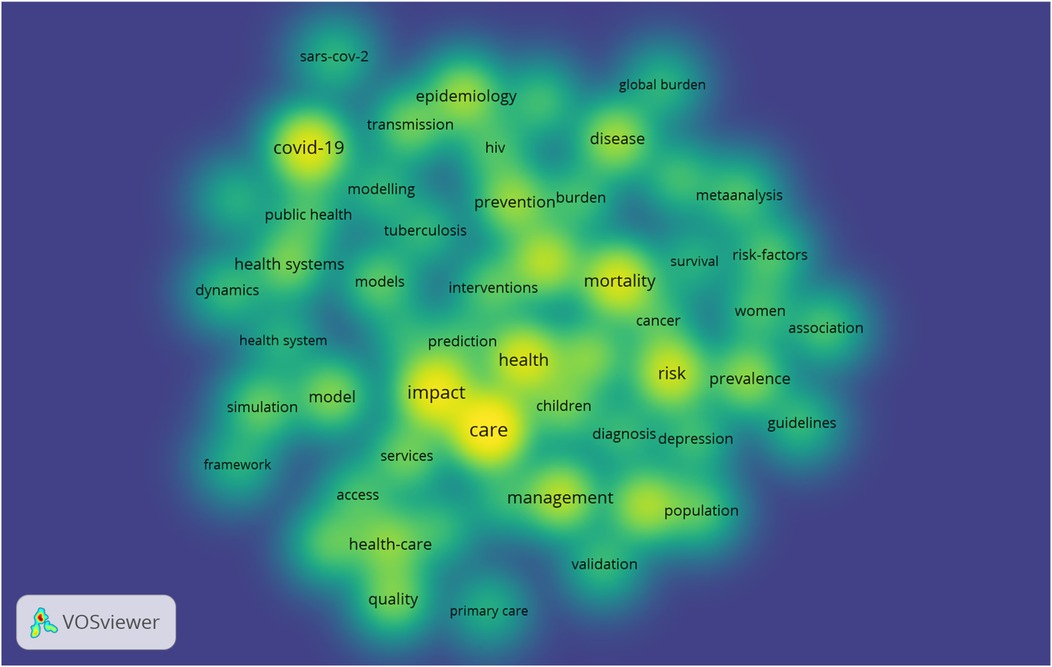 Results: A total of 2,023 records were retrieved. The annual publication growth rate was 7.53%, with an average of 9.35 co-authors per article and 37.67% international co-authorship. Leading journals included The Lancet and PLOS One, while prominent authors were Blakely T. and Hay S.I. Key contributing institutions were the Tehran University of Medical Sciences and the University of Washington. The United States and the United Kingdom were the most productive countries. Thematic analysis revealed prominent and emerging topics such as “health systems,” “modeling,” “predictive modeling,” and “systems dynamics” suggesting promising directions for future research.