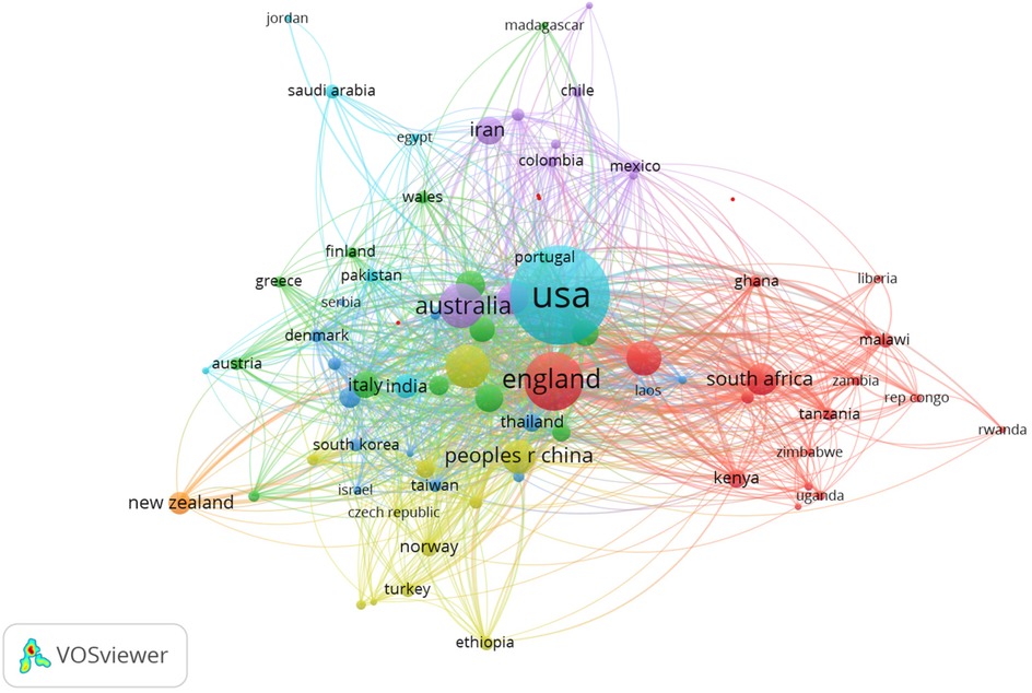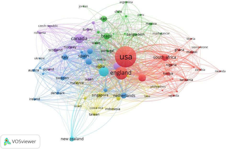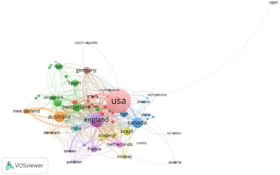 The bibliometric analysis identifies the USA and UK as gatekeepers within the global health systems modeling network. The USA, with 562 SCP and 171 MCP publications, and the UK, with an MCP ratio of 0.592, are the most important connectors influencing research agendas, funding, and publication dynamics. Their central roles in the collaboration network emphasize their strategic positioning as global research hubs. Conversely, countries such as Iran (MCP ratio = 0.246), Spain (0.298), and Italy (0.341) are relatively under-connected in this network. Despite their contributions, these lower MCP ratios suggest limited international collaboration, which may stem from barriers such as restricted access to international funding, institutional limitations, language differences, or fewer established global partnerships.