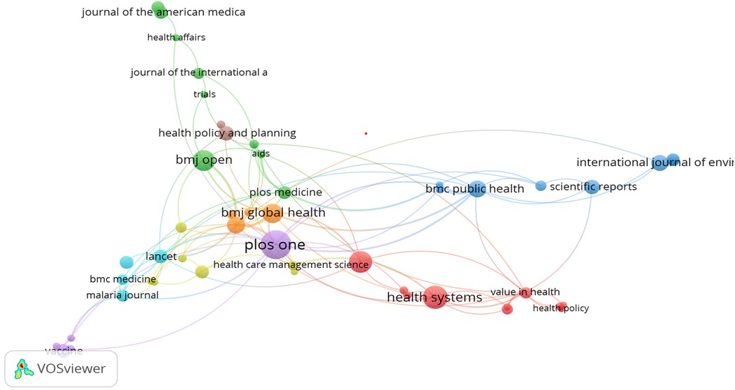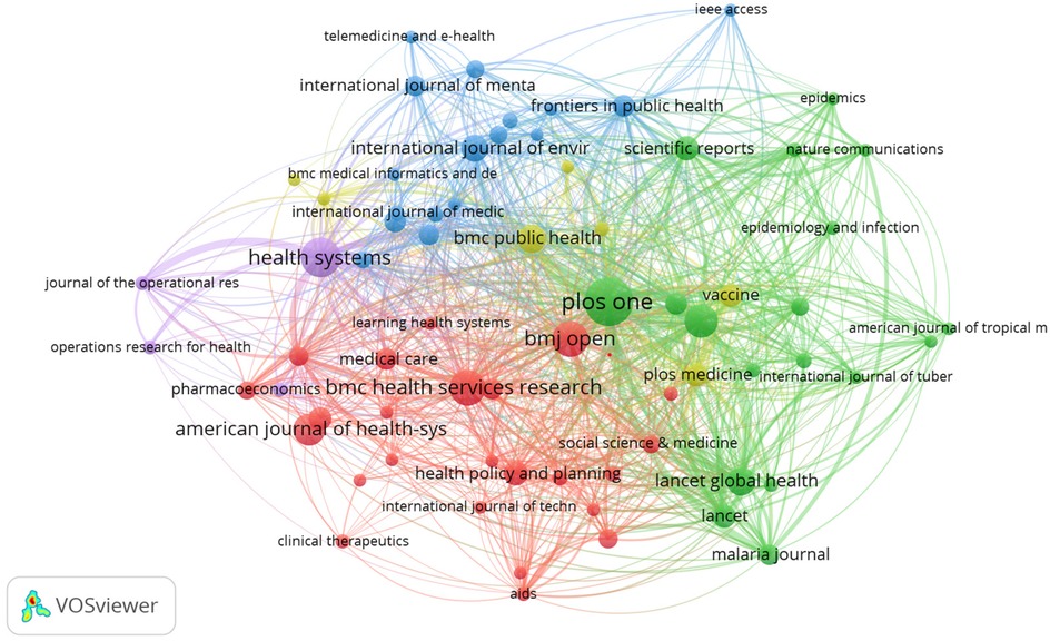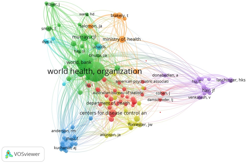 Table 3 shows the top 10 most cited articles and publications, represented by the author(s), the year the article was published, the title of the article, the journal that published the article, and the total number of citations (TC), for the research on health systems modeling. The bibliometric analysis identified the article authored by (68), titled: “Global, regional, and national life expectancy, all-cause mortality, and cause-specific Mortality for 249 Causes of Death, 1980–2015: A Systematic Analysis for the Global Burden of Disease Study 2015”, published by The Lancet as the most cited article worldwide, with the TC = 2,881. Vos T et al., (69) in an article titled: “Global, Regional, and National Incidence, Prevalence, and Years Lived with Disability for 328 Diseases and Injuries for 195 Countries, 1990–2016: A Systematic Analysis for the Global Burden of Disease Study” was the second most cited article, also published by The Lancet and with TC = 2,686. In fact, all the top 10 articles were published in journals with high impact factors, and six of the 10 articles were made up of multiple collaborators within the healthcare domain.