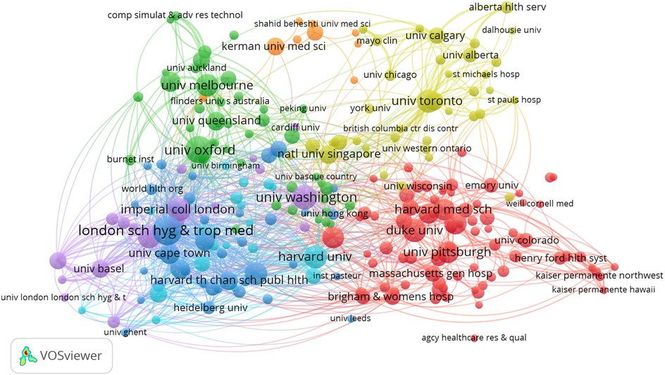 All the institutions and research centres in Table 9 are ranked at least in one of the two world university rankings (ARWU or QS). While the Tehran University of Medical Sciences is perceived to be in the 401–500 position on ARWU 2022 rankings, it has published many articles on health systems modeling. The ARWU's number one institution (Harvard University), number 5 on the QS ranking, has fewer publications (110) in health systems modeling. As noted, the dominance of institutions from the USA, followed by those from the UK, is apparent as these two countries have eight out of the 10 institutions within the top 10 slots. The noticeable inclusion of Iran and Canada in health systems modeling is a positive development.