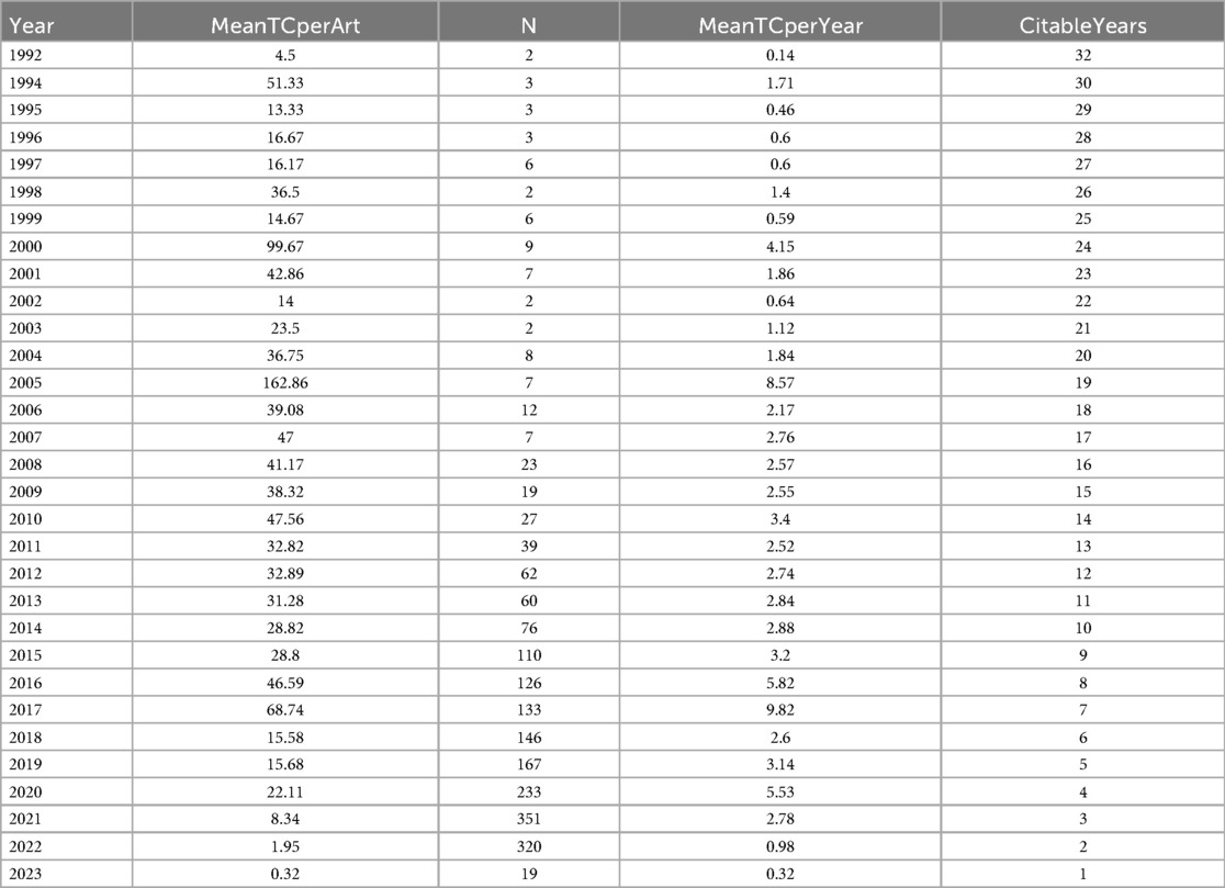 The h-index is a metric to assess individual publications' productivity and scholarly impact (78). It relates to the number of publications (N) contained within a corpus of articles, which have been ordered according to the frequency of their citation occurrences. The g-index, a derivative of the h-index, is a bibliometric measure that acknowledges scholarly articles that have garnered the highest number of citations within a specific dataset (64). The m-index is an alternative to the h-index and represents the h-index for each year starting from the initial publication (79).