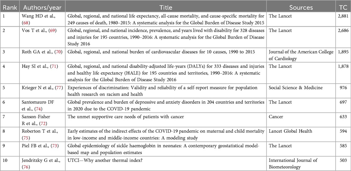 The Supplementary Material provides a detailed analysis of the most cited papers, focusing on the paper context, methodologies, findings, conclusions, and suggestions for future research as depicted in the studies. The 10 research papers span various topics across various fields, including oncology, epidemiology, biometeorology, and mental health. The most cited article (68) employed advanced modeling techniques such as the Cause of Death Ensemble Model (CODEm) and DisMod-MR to provide estimates of mortality and life expectancy across 195 countries. It offered a benchmark for comparative health system performance analysis by establishing global trends and identifying regional disparities in mortality outcomes. Similarly (69), expanded this work by modeling the incidence and prevalence of 328 diseases and injuries. Their methodological contributions enriched the global burden of disease (GBD) modeling framework and offered critical insights for resource allocation and health service prioritization at national and global levels.