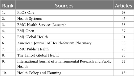 Table 4 depicts the 10 most relevant sources (journals and conference proceedings), identified by the total number of articles. These sources focused on various disciplines, including nursing, virology, HIV, psychiatry, tuberculosis and leprosy, and parasitology. As shown in the table, of the 10 most relevant sources, PLOS One was the most relevant journal with 68 articles, while the Health Policy and Planning journal was the “least” relevant with 18 articles.