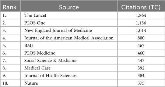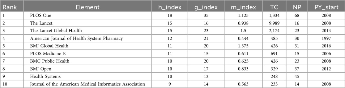 The results indicate that PLOS One has the highest h-index of 18, followed by The Lancet and The Lancet Global Health, with an h-index of 15. Although The Lancet Global Health has a higher g-index of 23 than The Lancet with 16, the latter is still highly rated because the h-index tends to consider both the highest number of publications and the highest number of citations, lowering the index compared to the g-index and m-index (79).
