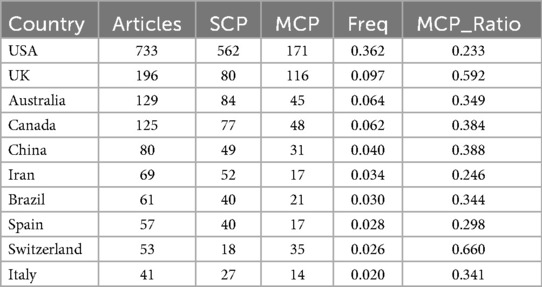 On the other hand, countries like Switzerland (MCP ratio = 0.660), Brazil (0.344), and China (0.388) represent emerging research communities with growing international engagement. Switzerland, in particular, stands out for its high MCP ratio despite a modest publication count (53 articles), signaling its increasing integration and influence within global research networks. Brazil and China, with rising publication outputs and moderate international collaboration, also show strong potential to expand their global research presence further.