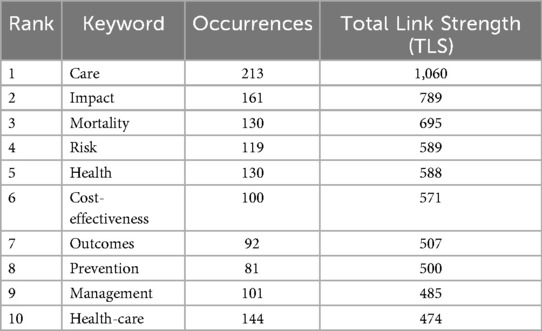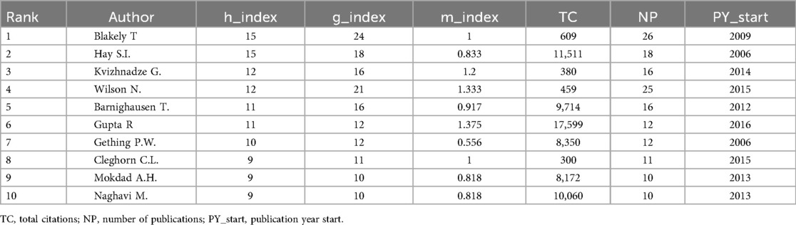 Table 8 lists the top 10 authors based on the h-index. Blakely T. and Hay S.I. are the top authors in the field of health systems modeling for the period 1992–2023. Blakey T. is in the top position because of a higher g-index and the number of publications. The author also started to publish in 2009, as opposed to Hay S.I., who was in the second position, which started earlier in 2006. Although Wilson N. has the second most publications (NP = 25), he is in the fourth position because of a lower h-index than Blakely (15), Hay (15), and Kvizhnadze (12). It has been suggested that the h-index predicts future scientific achievements more accurately than other research metrics (79).