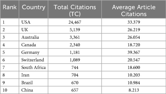 Table 10 reflects the countries that produced the top 10 highest number of citations within the period under review. In the corpus of selected articles, many authors cited scientific articles originating from the USA, which amassed 24,467 citations. The UK emerged as the second most frequently cited country with 5,139 citations. Australia also received a notable share of citations, with its scientific output accruing 3,361 citations and exhibiting an average article citation of 26.054. Remarkably, South Africa was featured among the top 10 most frequently cited countries, with 744 articles on the subject matter.
