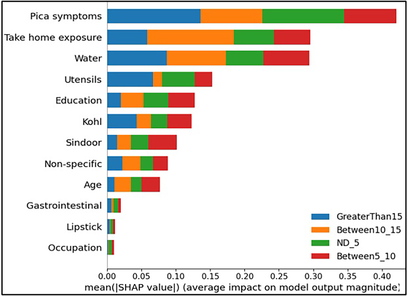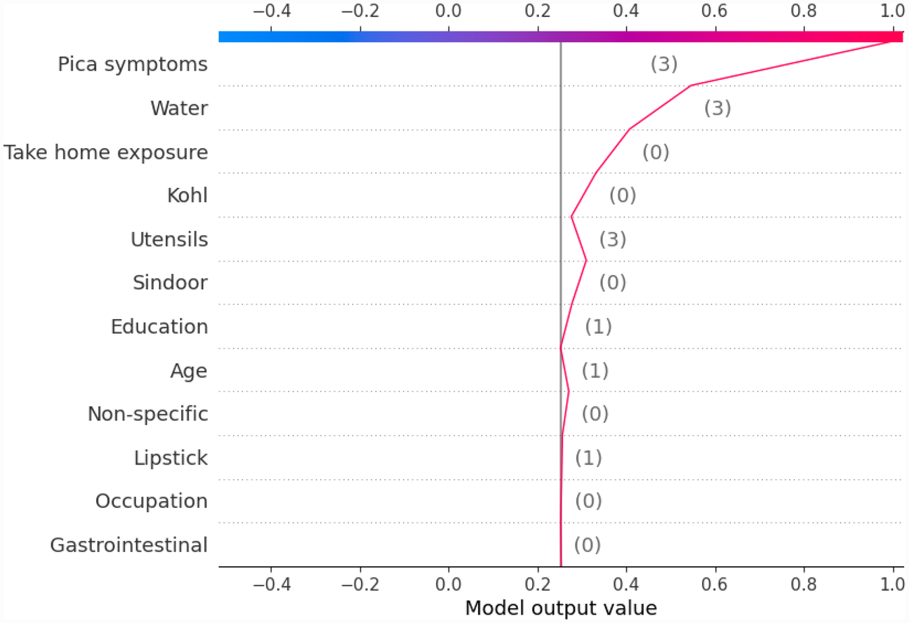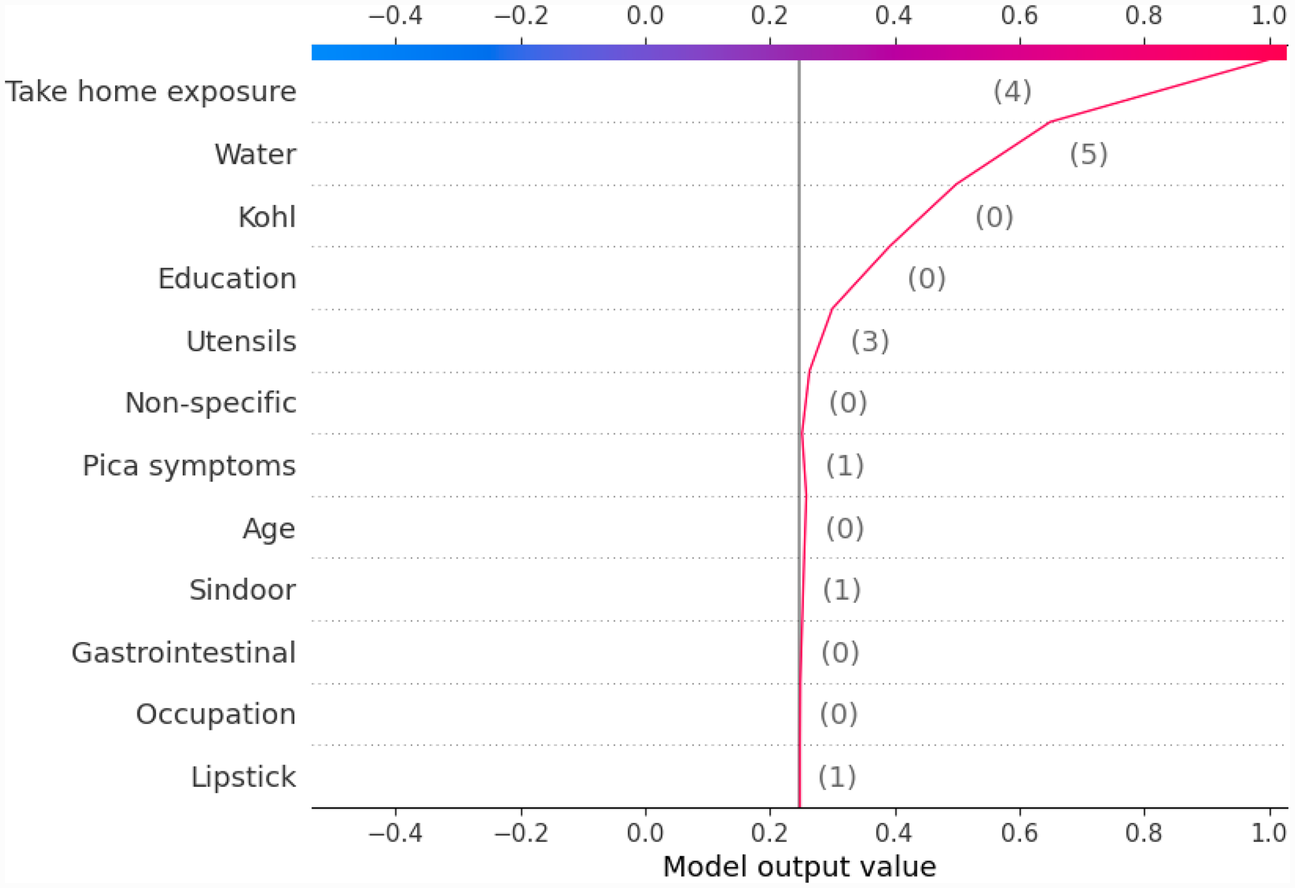 First, a set of global plots is shown to visualise the overall contribution of a feature over the entire data and how these features influence the output of the built lead prediction model. The global effect of the 12 features is shown in Figure 3 through a summary bar plot. In this plot, the 12 features are evaluated by their average absolute SHAP value; hence if the feature has a positive or a negative influence on prediction does not matter. The features are ranked from the highest to lowest impact on the prediction. The summary bar plot indicates the average impact (magnitude) of each feature in the prediction of the class labels. From the summary bar plot in Figure 3, it is found that the pica symptoms, water, and take-home exposure are the top three features that have the most predictive power.
