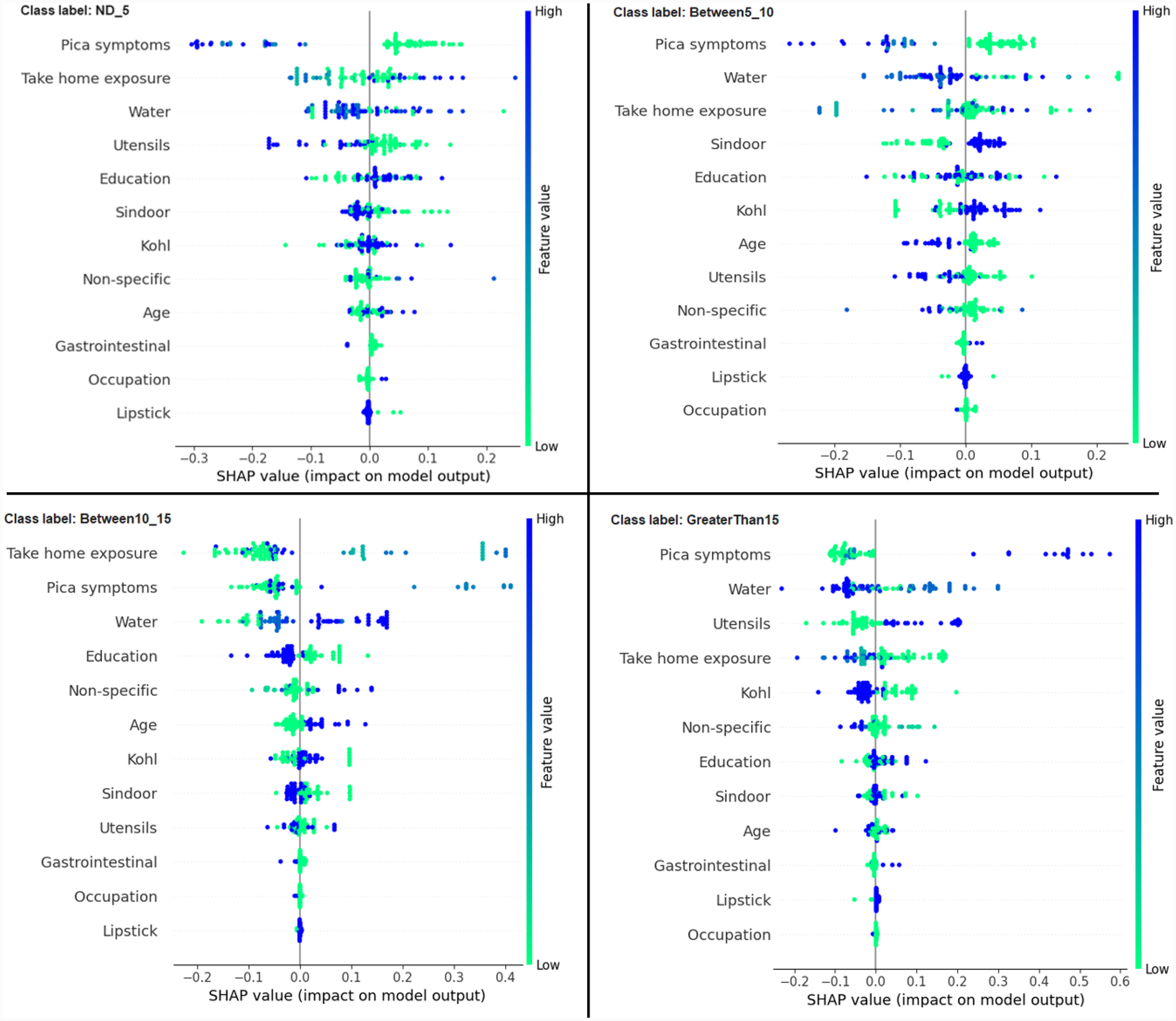 Another global plot, the beeswarm summary plot is shown in Figure 4 for each class label ND_5, Between5_10, Between10_15, and GreaterThan15. The little dots on the plot in Figure 4 correspond to an individual data instance (a single observation). The horizontal axis represents the SHAP value, and the colour of the dots indicates if that observation has a lower (green dots) or higher (blue dots) SHAP value than other observations. The x-axis shows the positive or negative influence of the feature on the predicted class label. The SHAP values toward the left have a “negative” effect and SHAP values toward the right have a “positive” effect on the output class label. In the top left figure in Figure 4, it is observed that the lower SHAP value for pica symptoms (green dots) results in the model classifying the observation as class label ND_5. In the bottom right figure, a higher SHAP value of pica symptoms results in the model classifying the observation as class label GreaterThan15. This indicates that the subjects having no pica symptoms have low lead exposure (ND_5), whereas those having pica symptoms have a high lead toxicity level (GreaterThan15). Hence, by using the SAHP global plot, we have the visibility of what are the top significant feature out of 12 features.