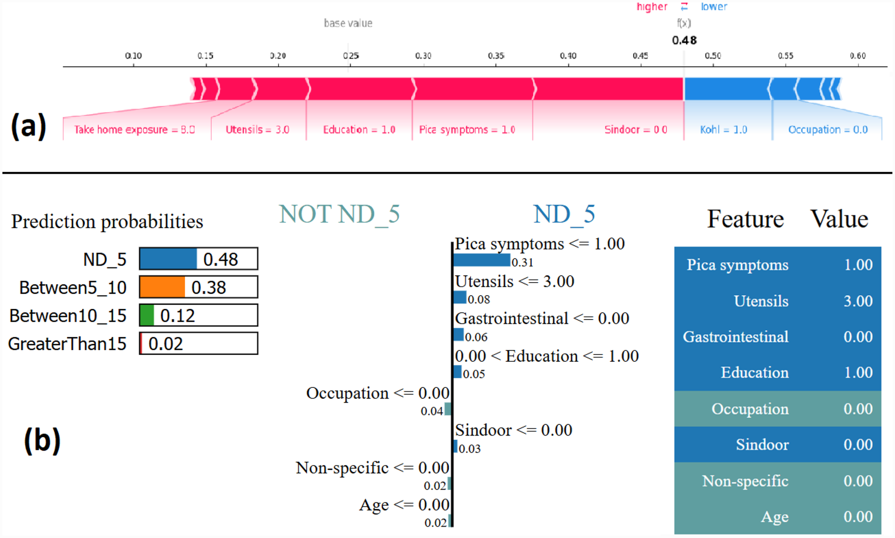 Example of the output class ND_5: (a) Interpretation of model prediction results based on SHAP, (b) Explanation provided by the LIME model.