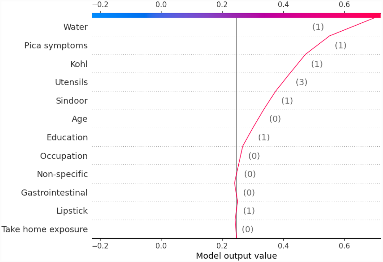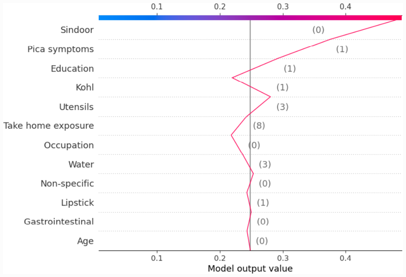 In the initial work, we demonstrated the possibility of using ML techniques for predicting lead levels in pregnant women using a set of sociodemographic features. From our initial work, we know that the 12-features-based lead prediction model gave the best performance accuracy; however, we don’t know to what extent each feature individually contributed to building the prediction model. In this context, there is a general distrust among stakeholders in using the ML models. These models are considered black boxes whose results are difficult to understand and interpret. The built lead prediction model is expected to demonstrate transparency and explain the rationale behind the predictions. Therefore, it is desired that the built models can explain the prediction made and correctly quantify the level to which its decisions are reliable (22). The growing complexity of ML models has led to growing scientific interest in XAI. In this paper, we demonstrate a first attempt to use XAI to explain the outcomes predicted by the lead prediction model. In this paper, a web-based application is also developed as an interface to display the outcome of ML prediction and XAI results. The interface helps in comprehending all the results at one point for interpretation.