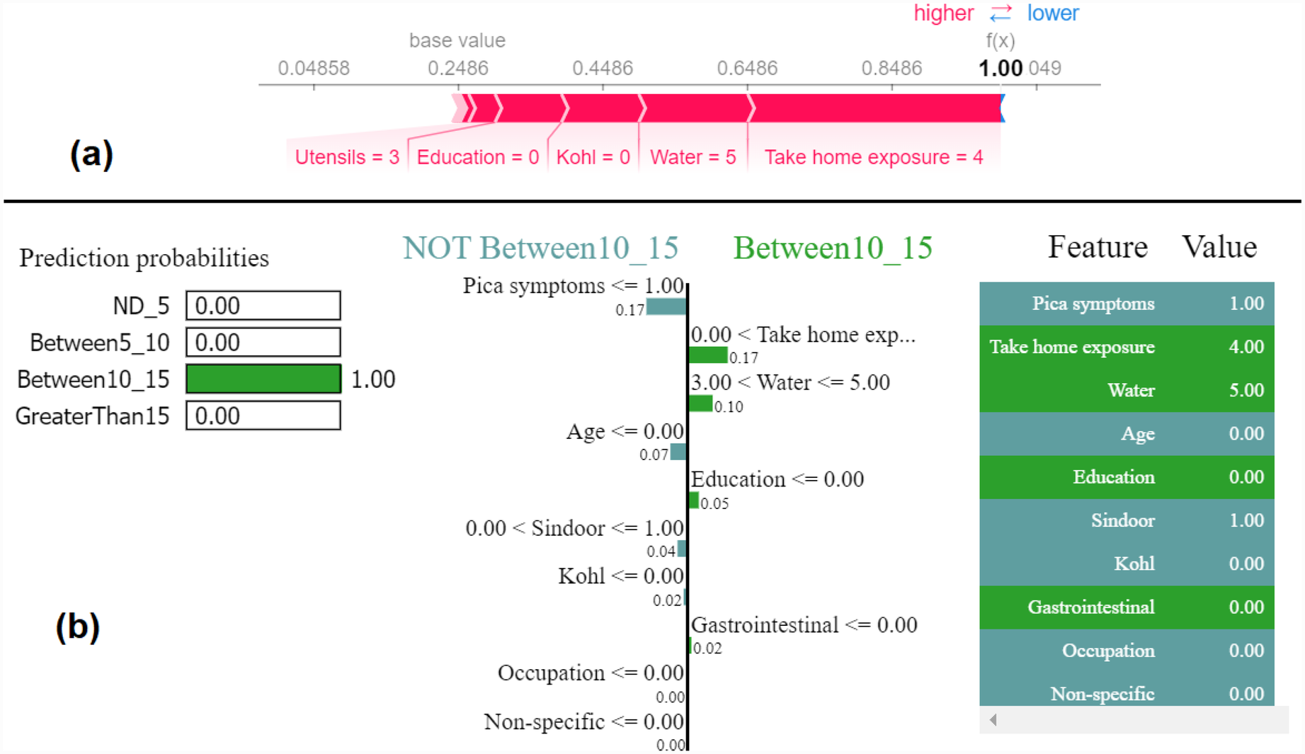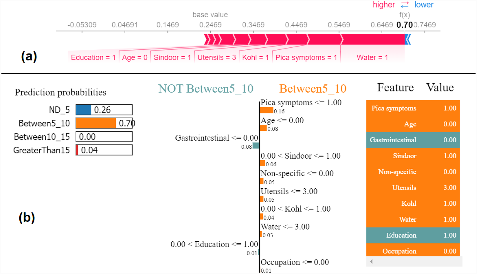 Example of the output class Between5_10: (a) Interpretation of model prediction results based on SHAP, (b) Explanation provided by the LIME model.