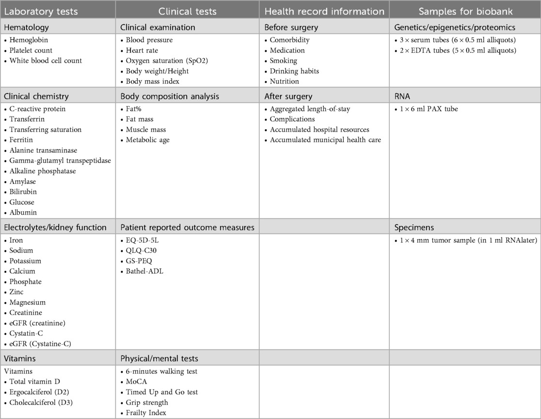 Participants will be screened and recruited from the pool of patients with diagnosed colorectal cancer at Vestre Viken Health Trust (Bærum and Drammen hospitals). Upon intervention, all enrolled participants get a consultation with a surgeon, a geriatrician, and a clinical nutritionist. A complete physical examination, including cardiovascular, respiratory, gastrointestinal, and neurological system assessment will be done, as well as registration of comorbidities according to the Charlson Comorbidity Index (45). A standard panel of preoperative blood samples is analyzed by the local laboratory (Table 2). The patients are tested prior to inclusion, after intervention and 4–6 weeks after surgery (Figure 4). Blood samples for the molecular analyses are drawn by laboratory personnel at the same timepoints. Testing and randomization will be done at Bærum hospital premises by trained study nurses. Intervention is provided by physiotherapists with special education in physical activity and cancer care.